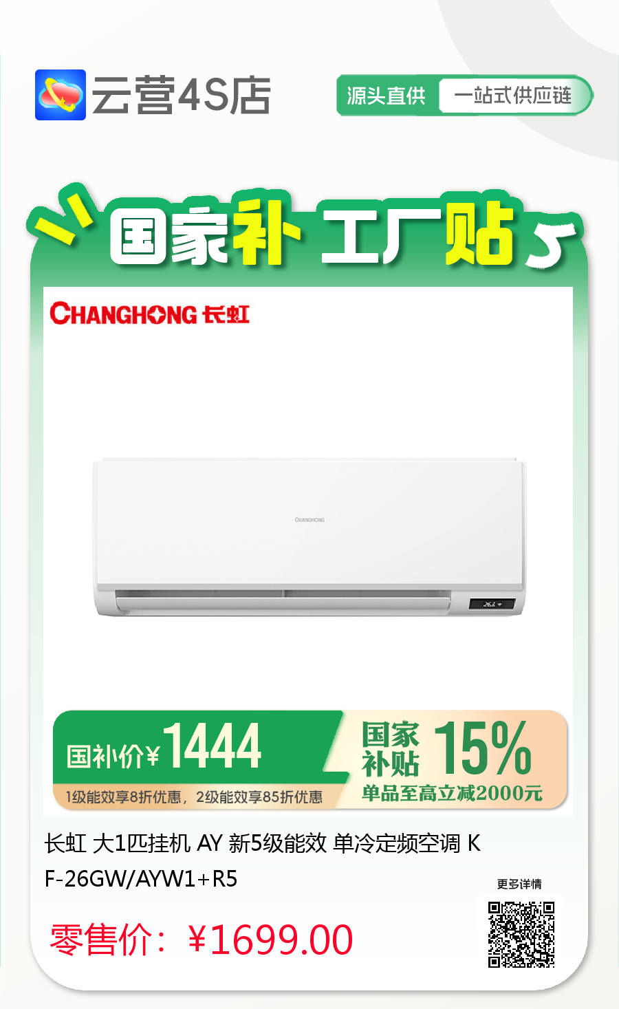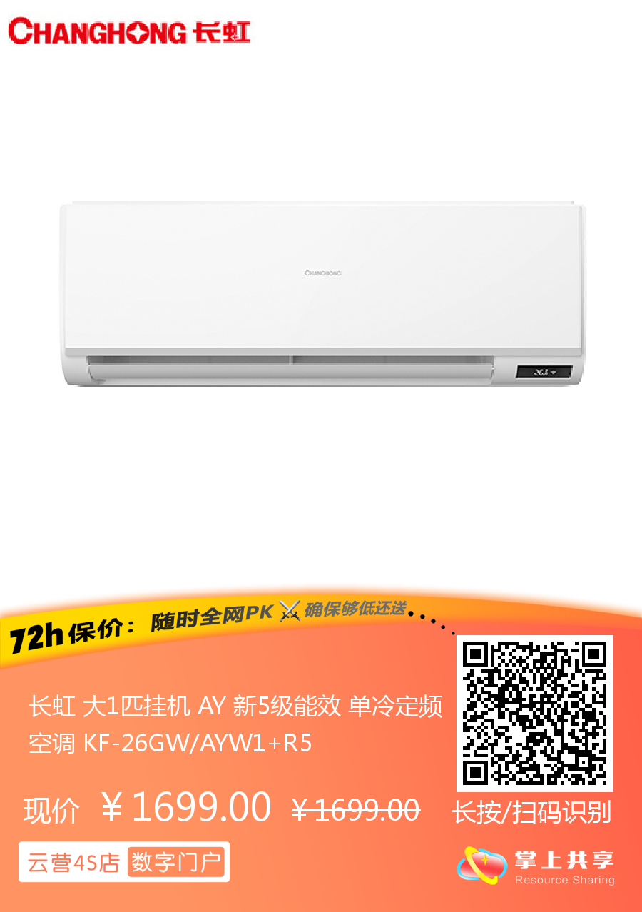 长虹 大1匹挂机 AY 新5级能效 单冷定频空调 KF-26GW/AYW1+R5