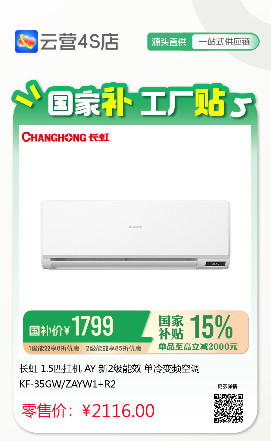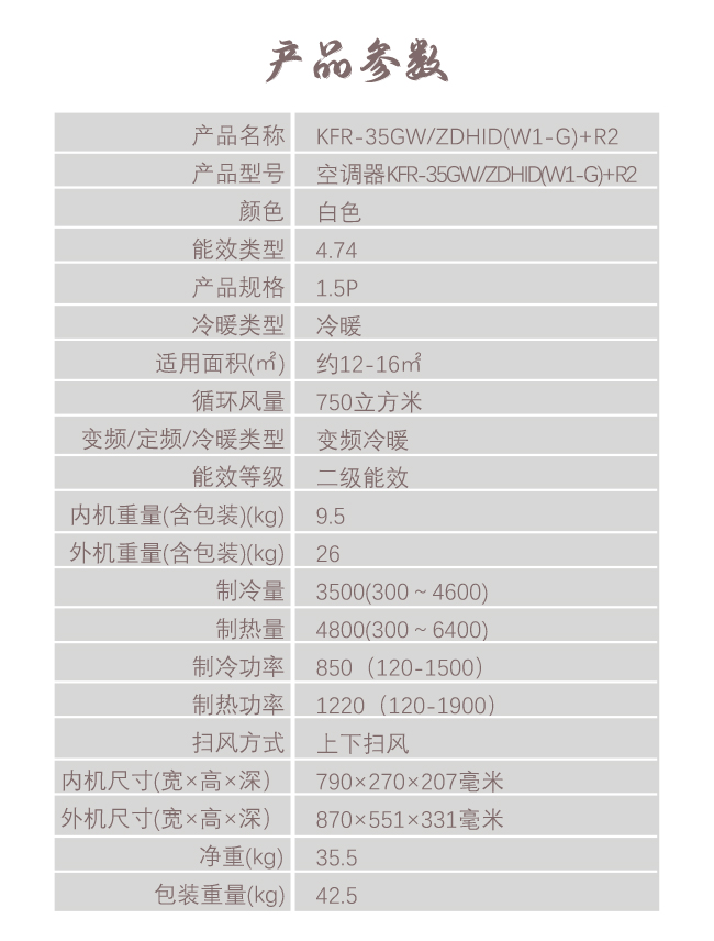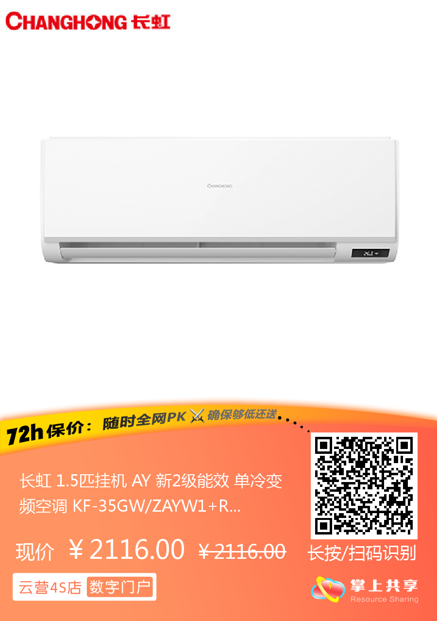 长虹 1.5匹挂机 AY 新2级能效 单冷变频空调 KF-35GW/ZAYW1+R2