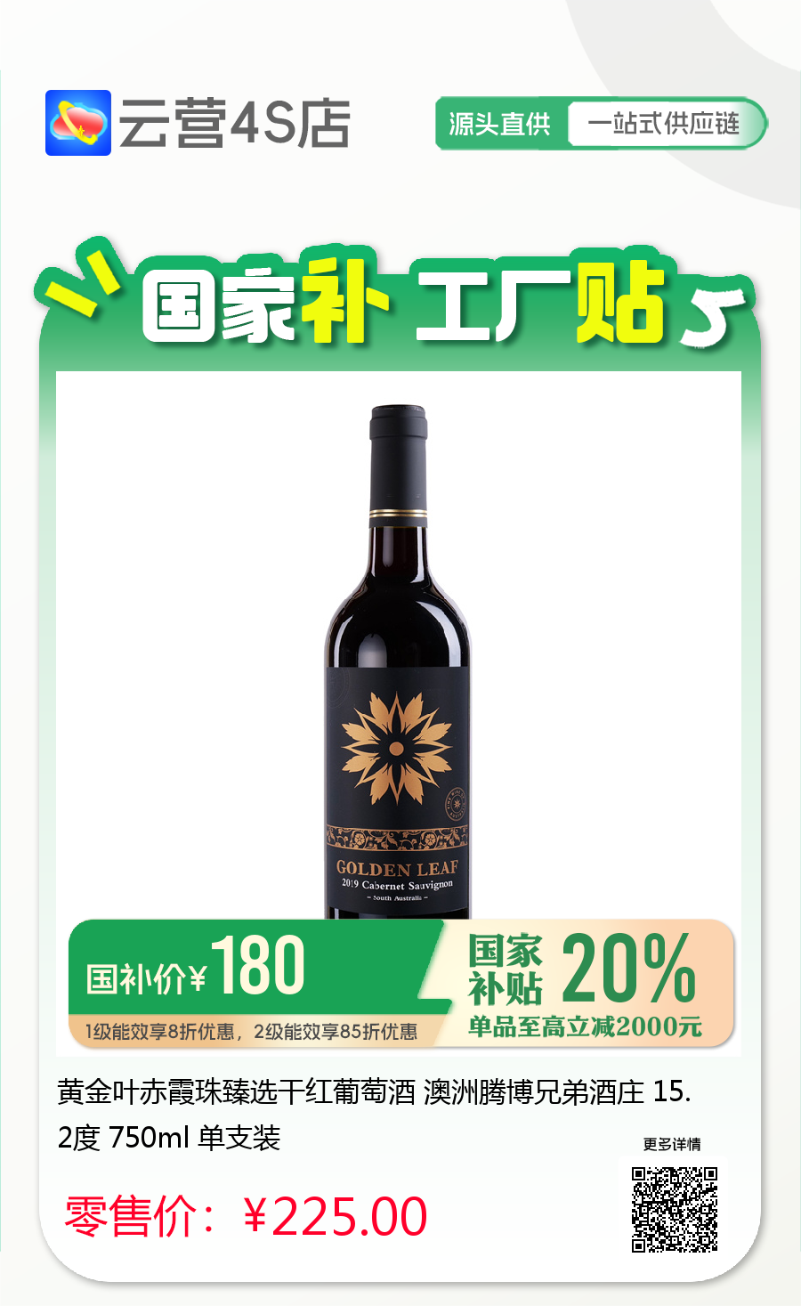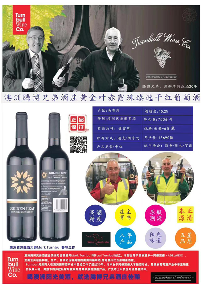 黄金叶赤霞珠臻选干红葡萄酒 澳洲腾博兄弟酒庄 15.2度 750ml 单支装