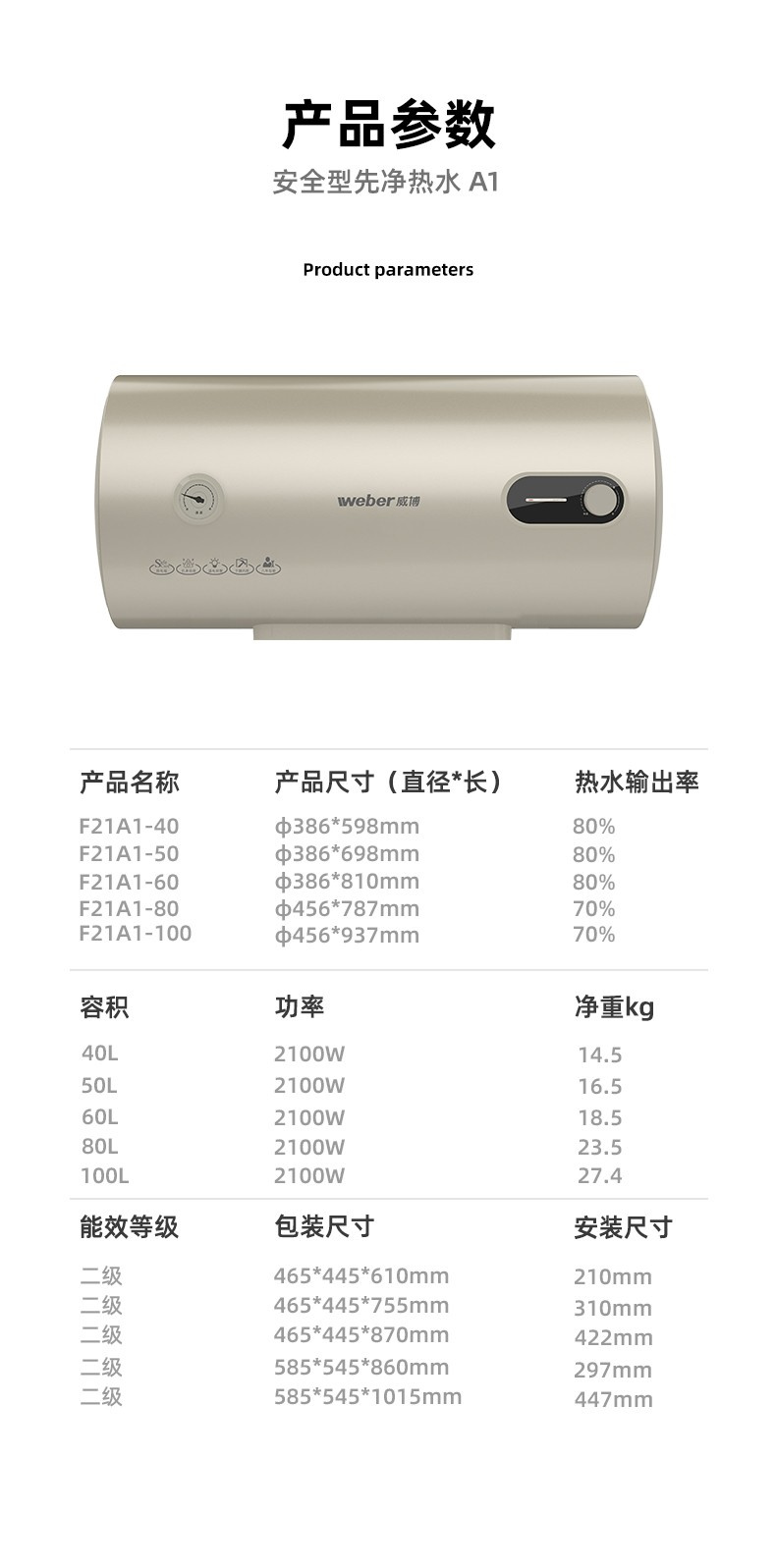 F20A1金色 40/50/60/80/100L 2000W 储水式电热水器 机械操控 威博