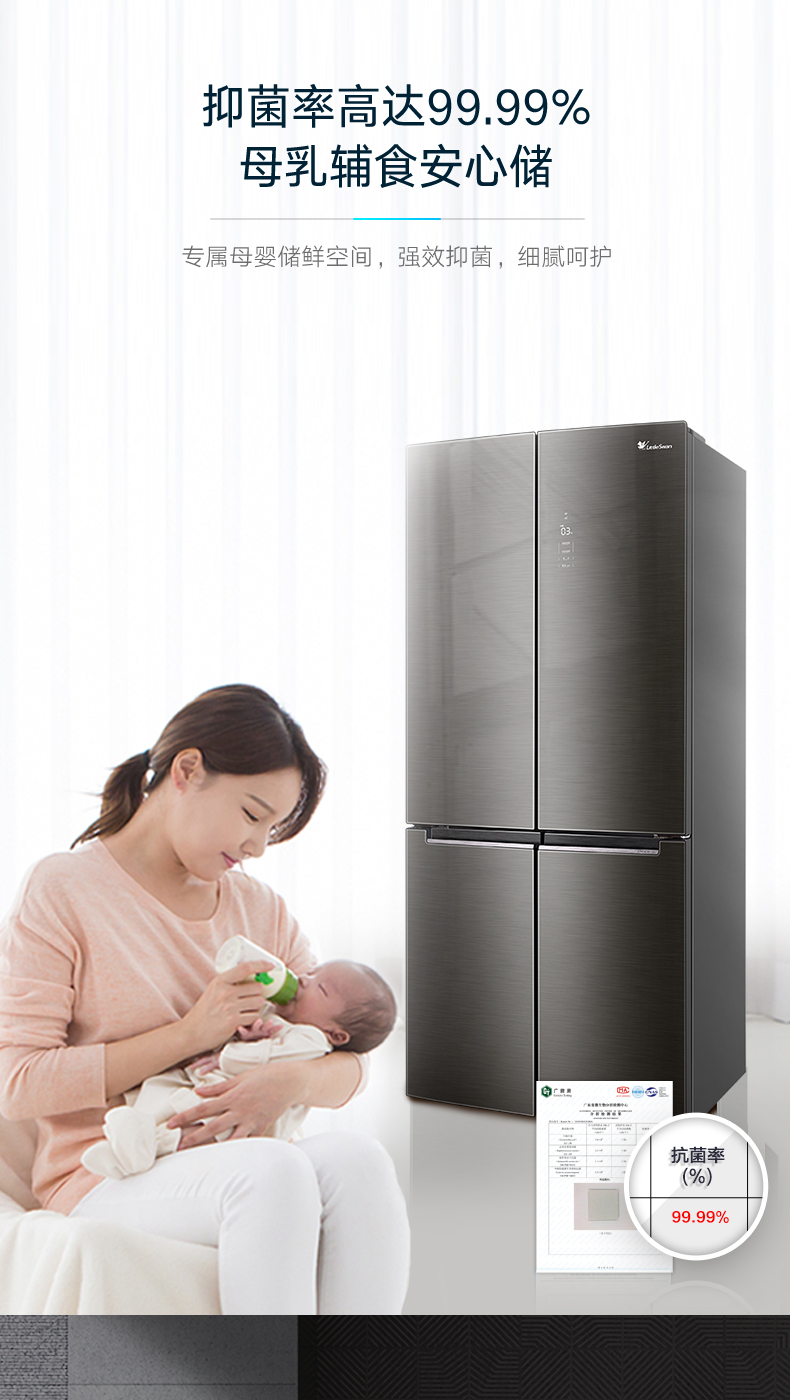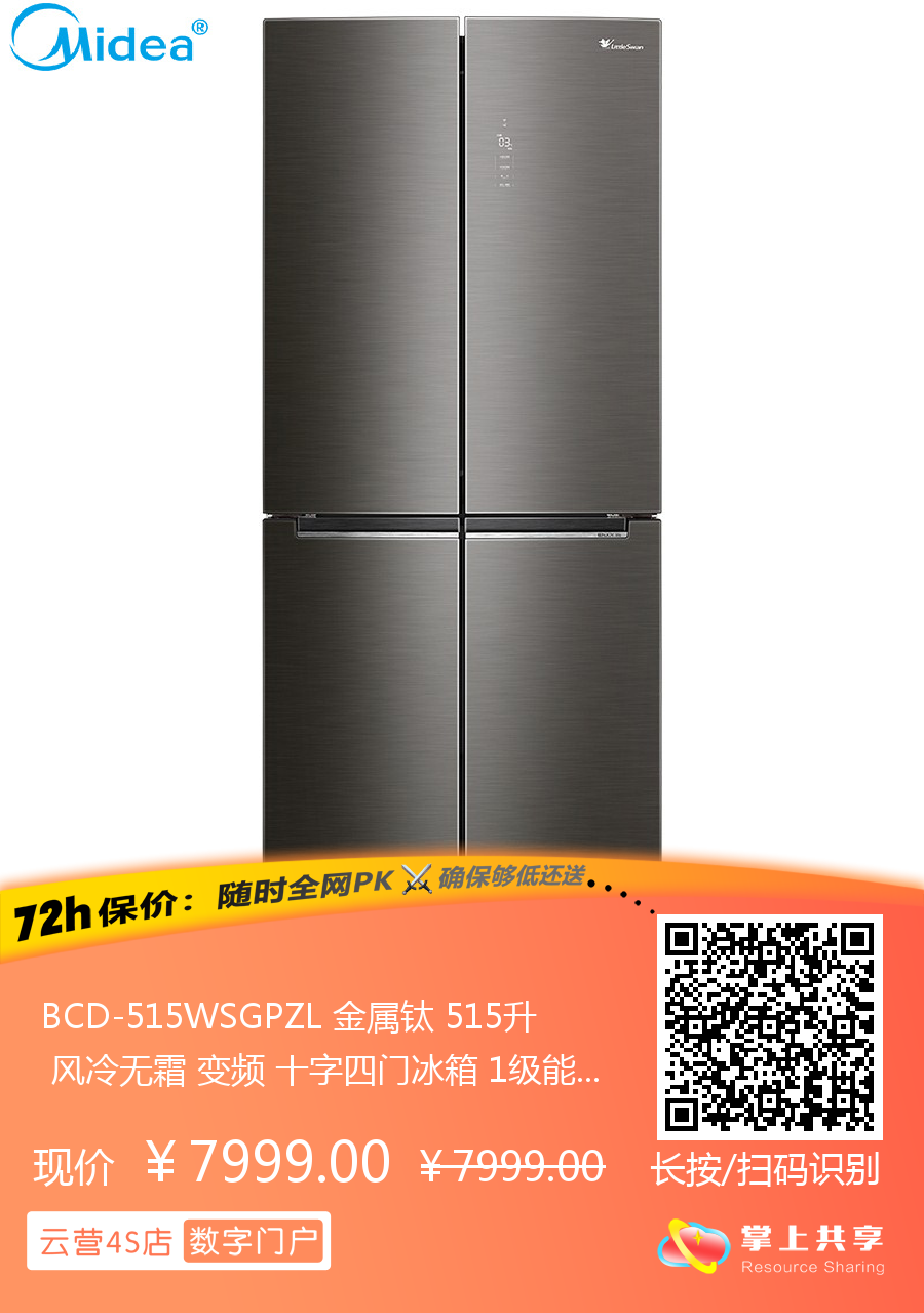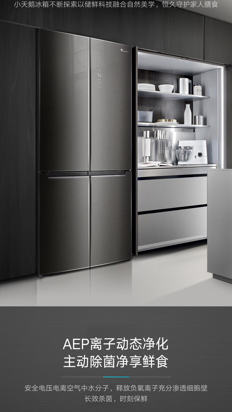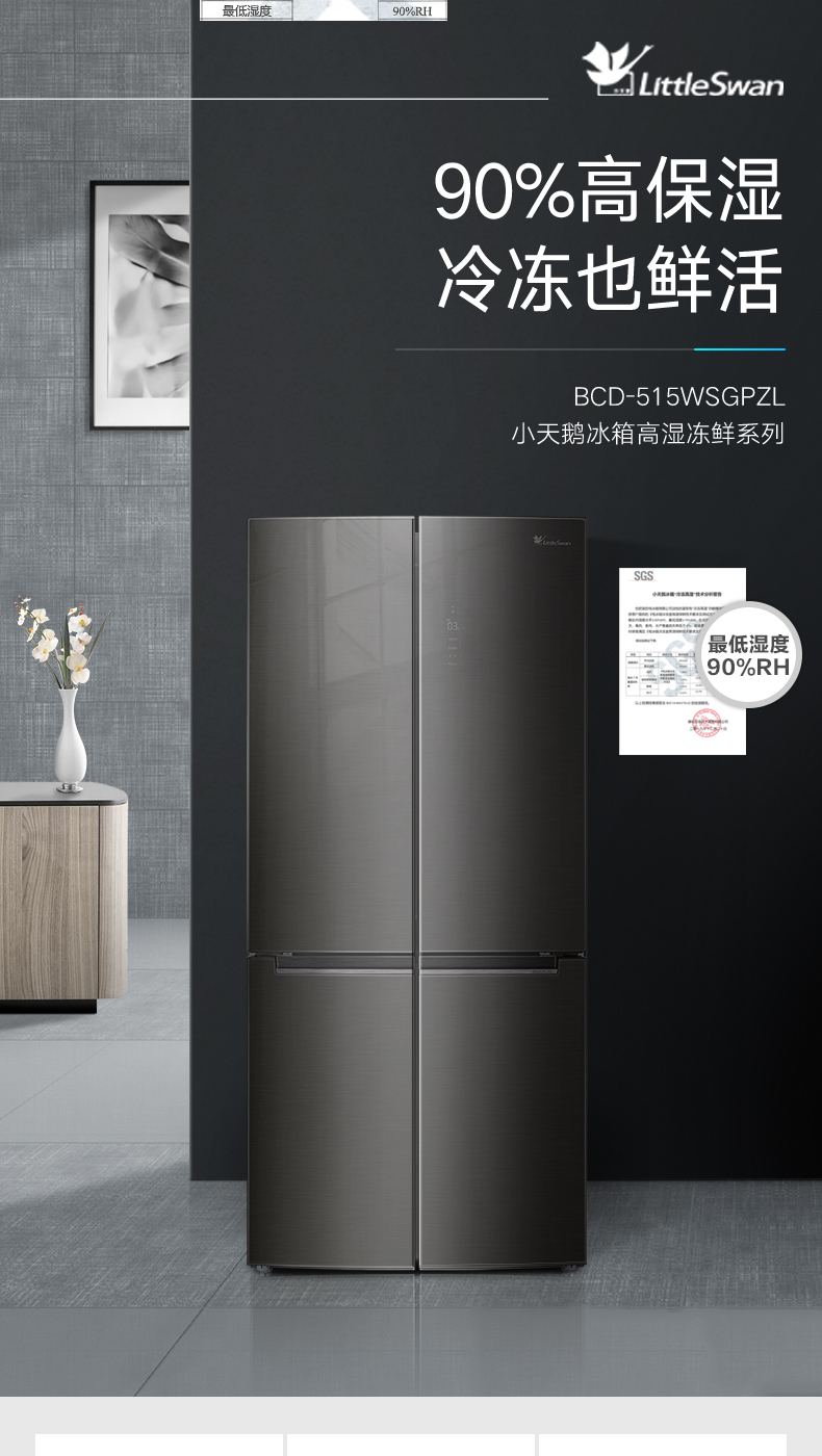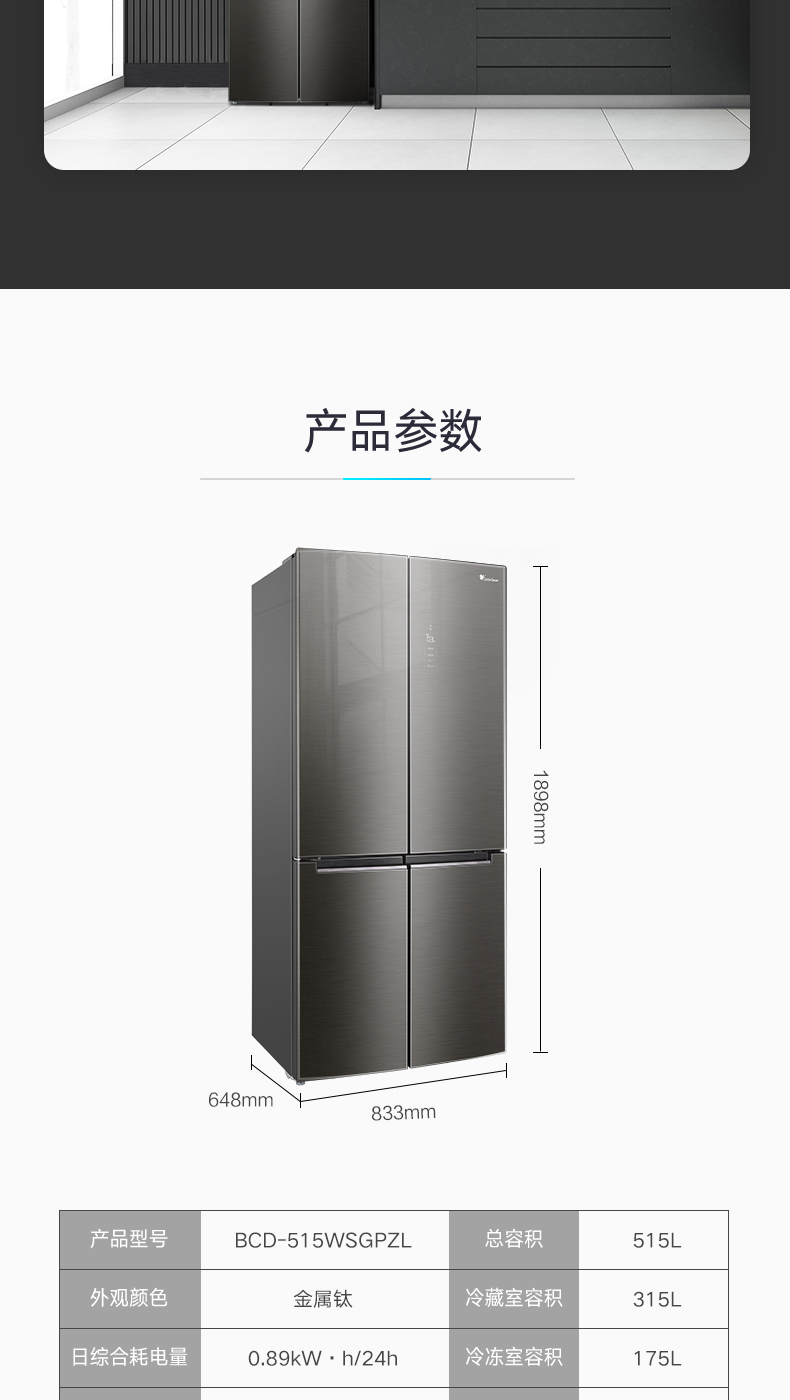 BCD-515WSGPZL 金属钛 515升 风冷无霜 变频 十字四门冰箱 1级能效 小天鹅(LitteSwan)