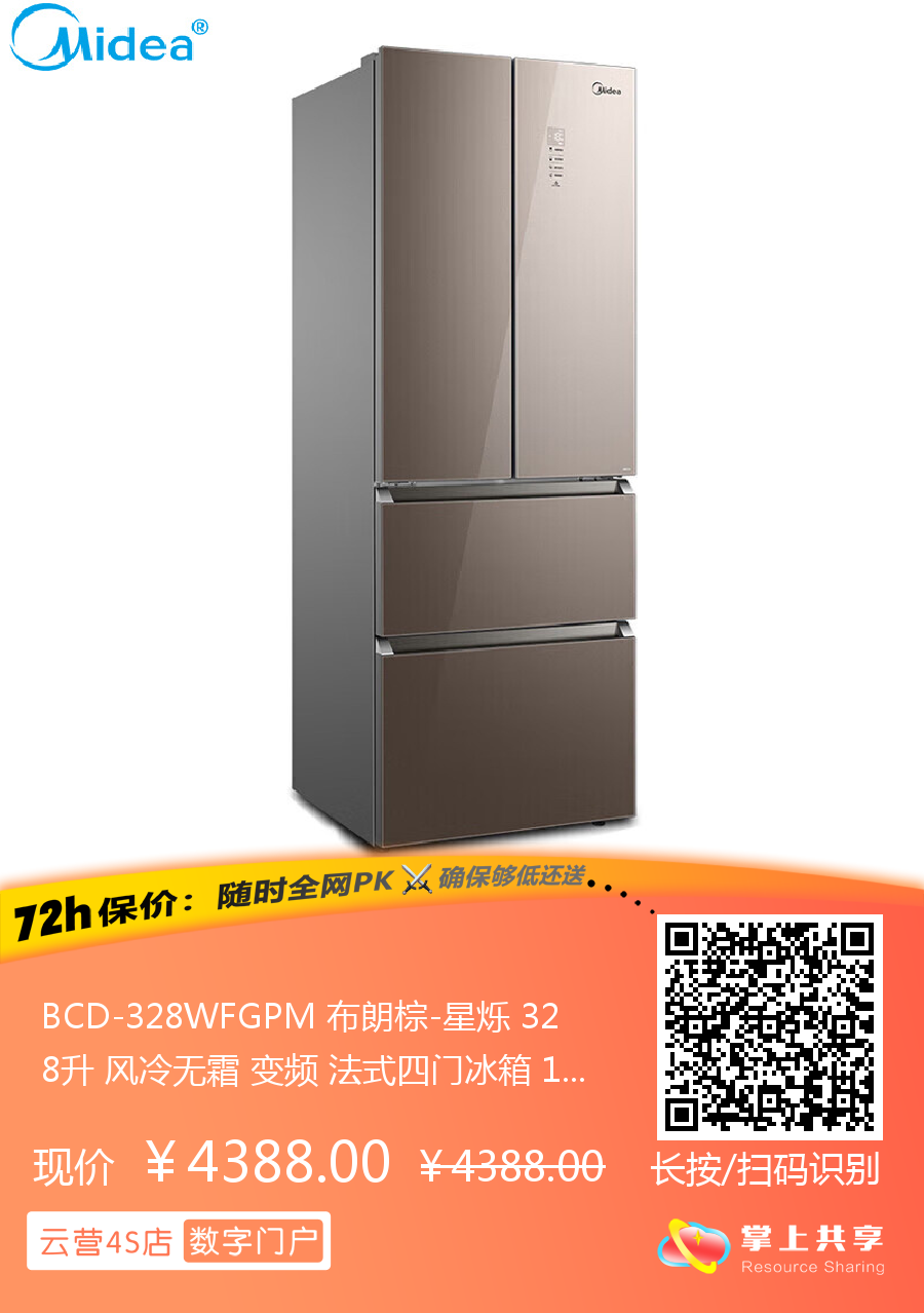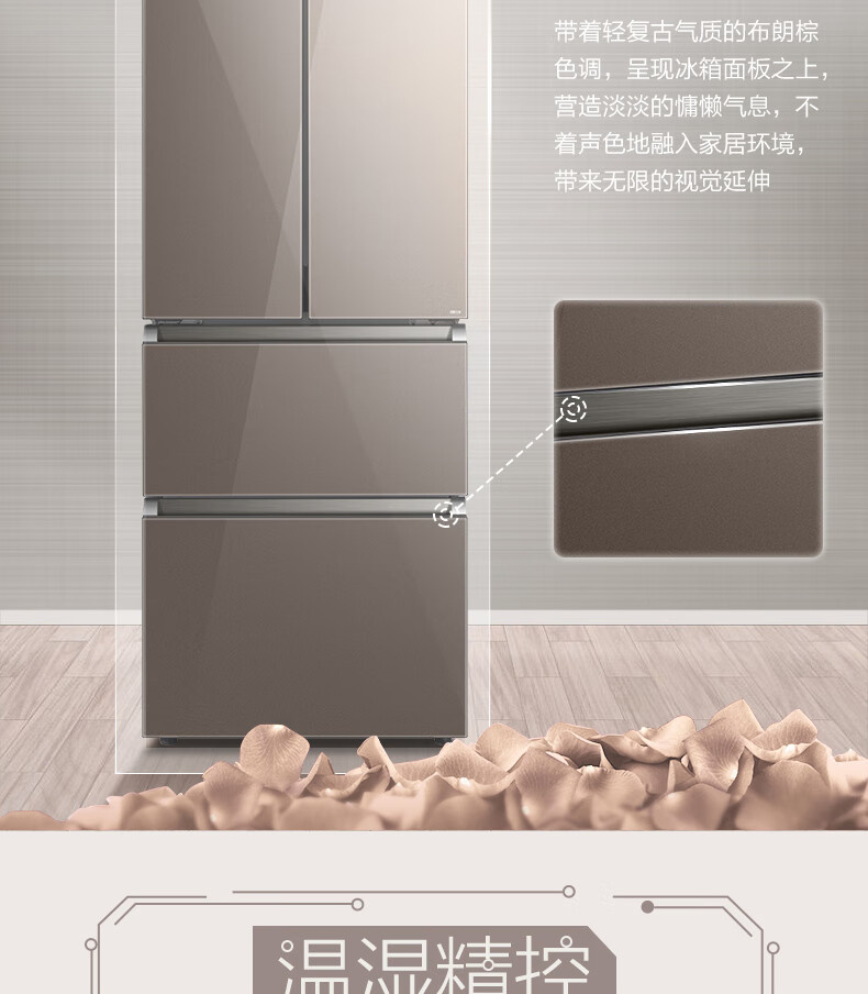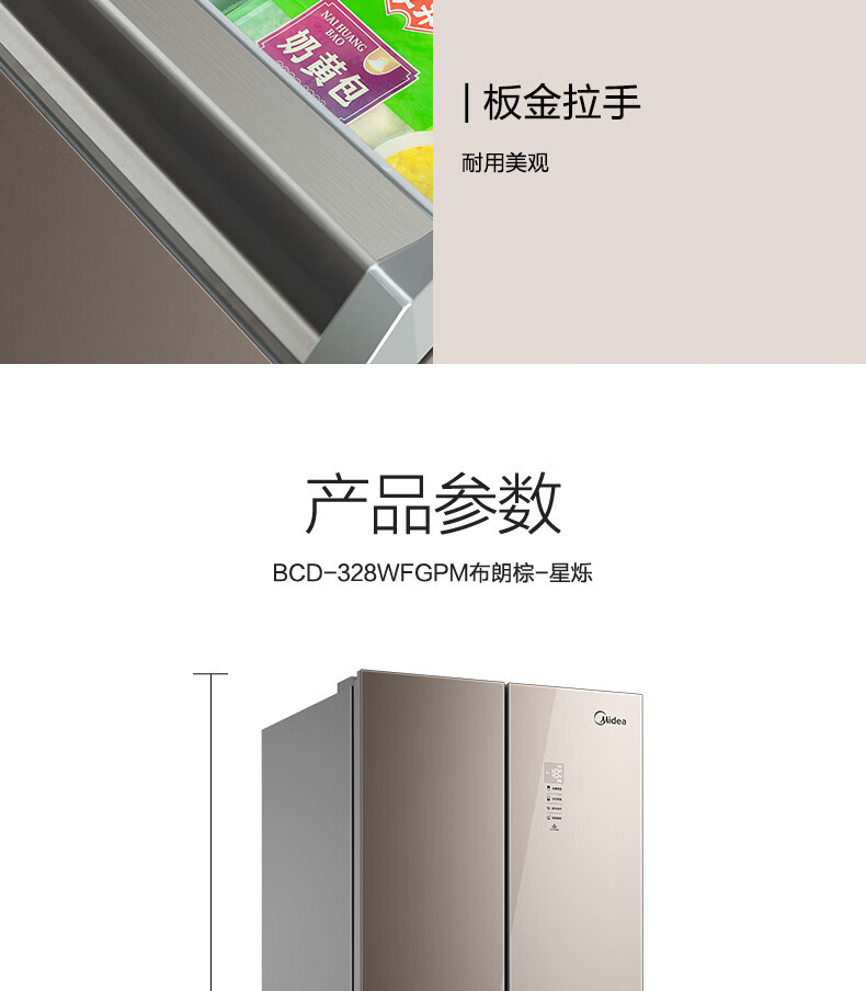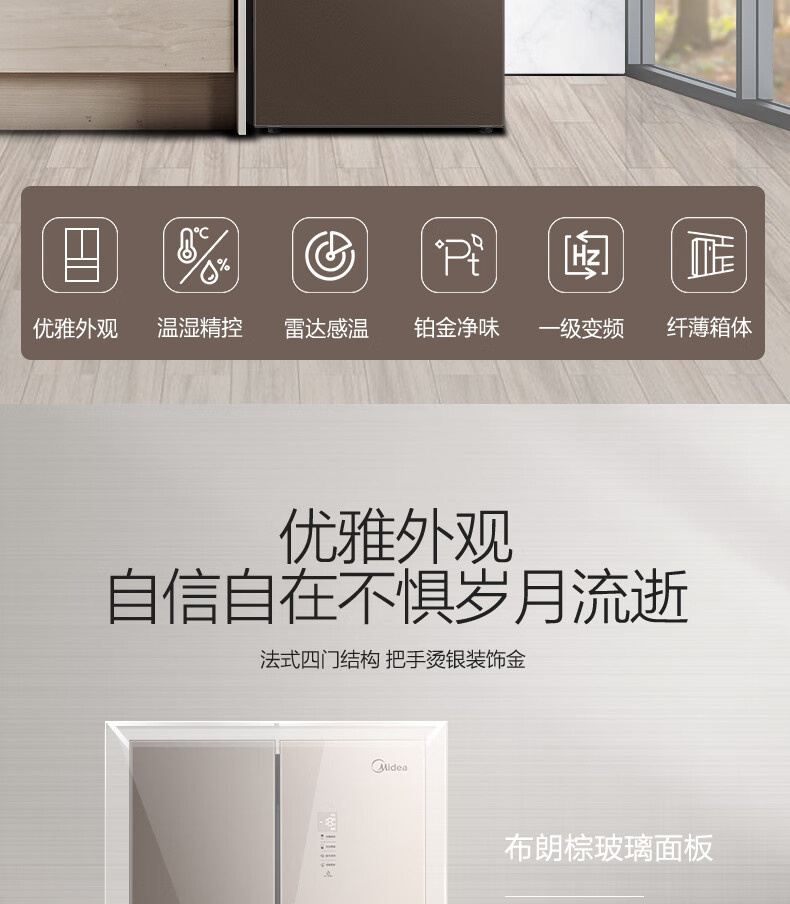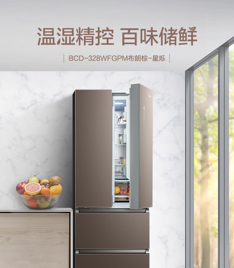 BCD-328WFGPM 布朗棕-星烁 328升 风冷无霜 变频 法式四门冰箱 1级能效 美的(Midea)