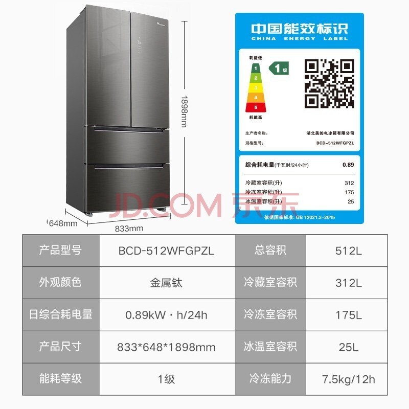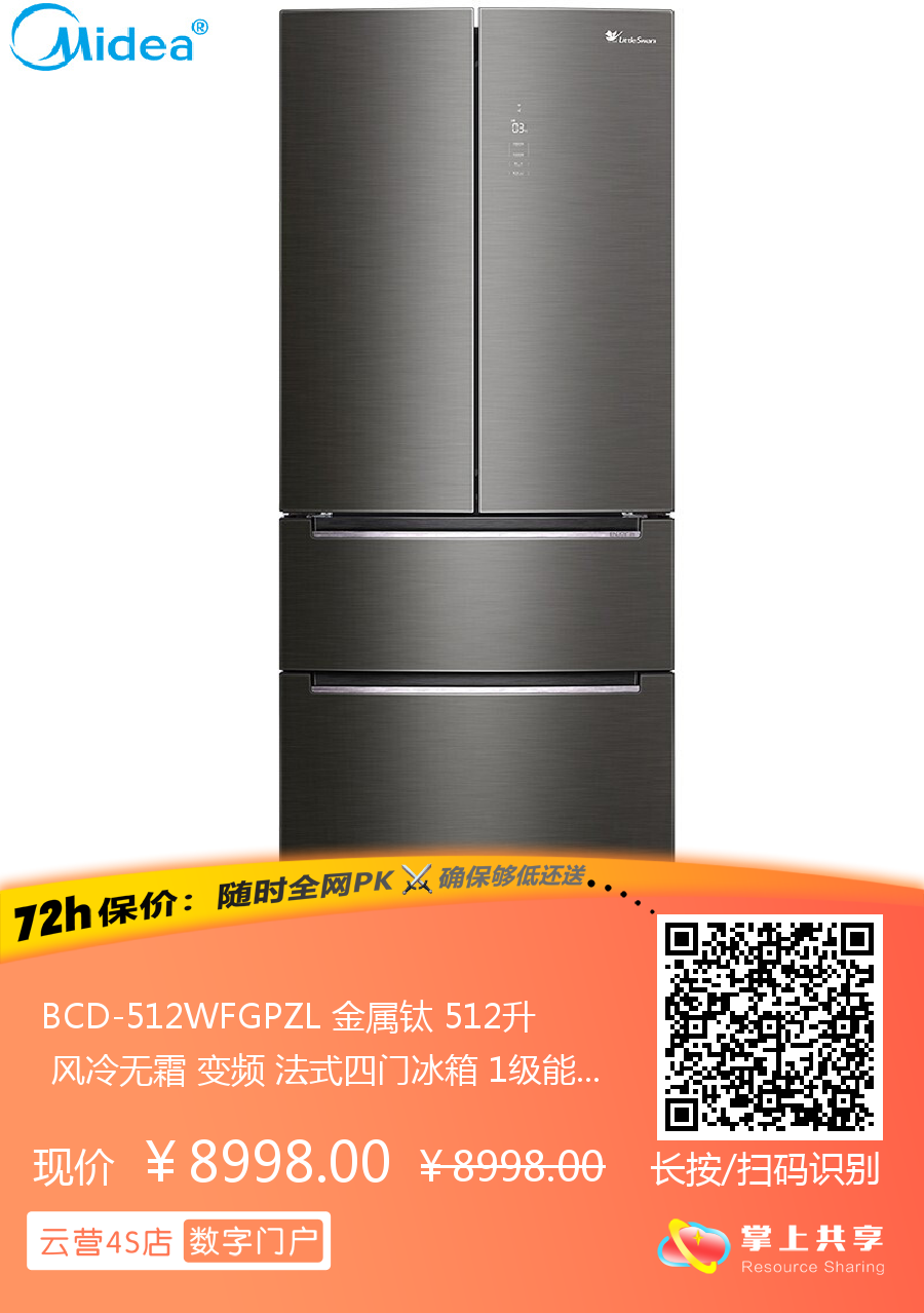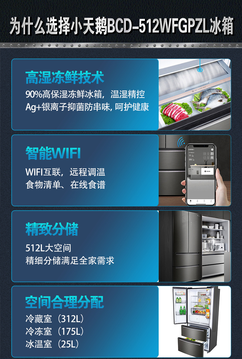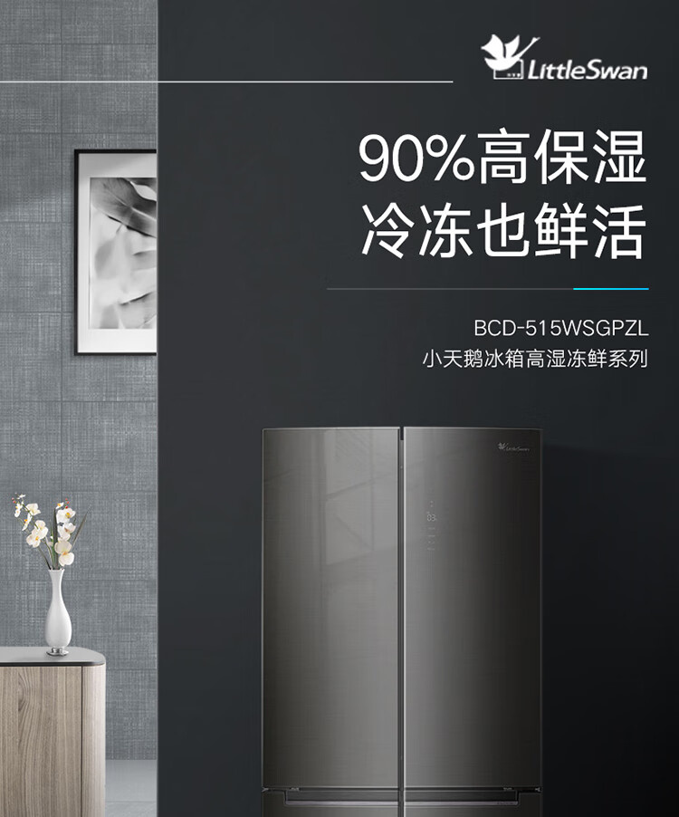 BCD-512WFGPZL 金属钛 512升 风冷无霜 变频 法式四门冰箱 1级能效 小天鹅(LitteSwan)