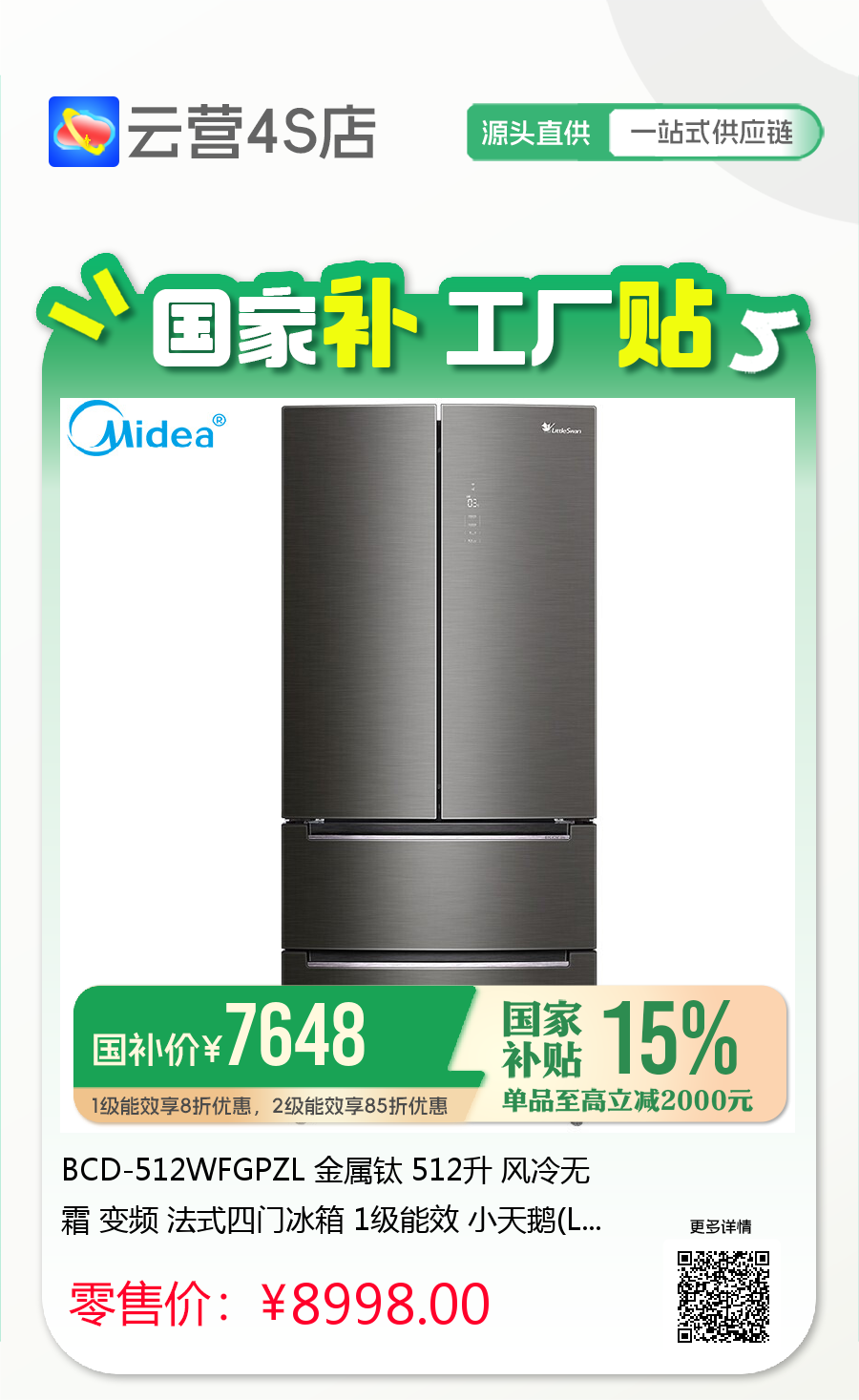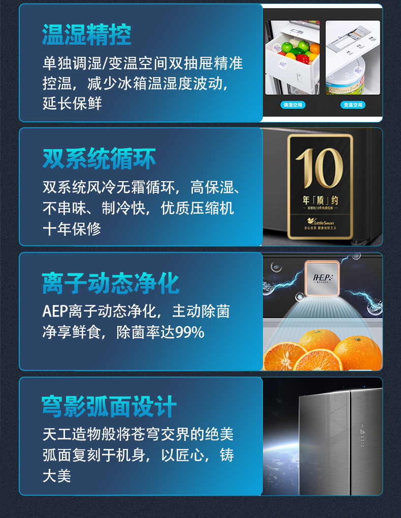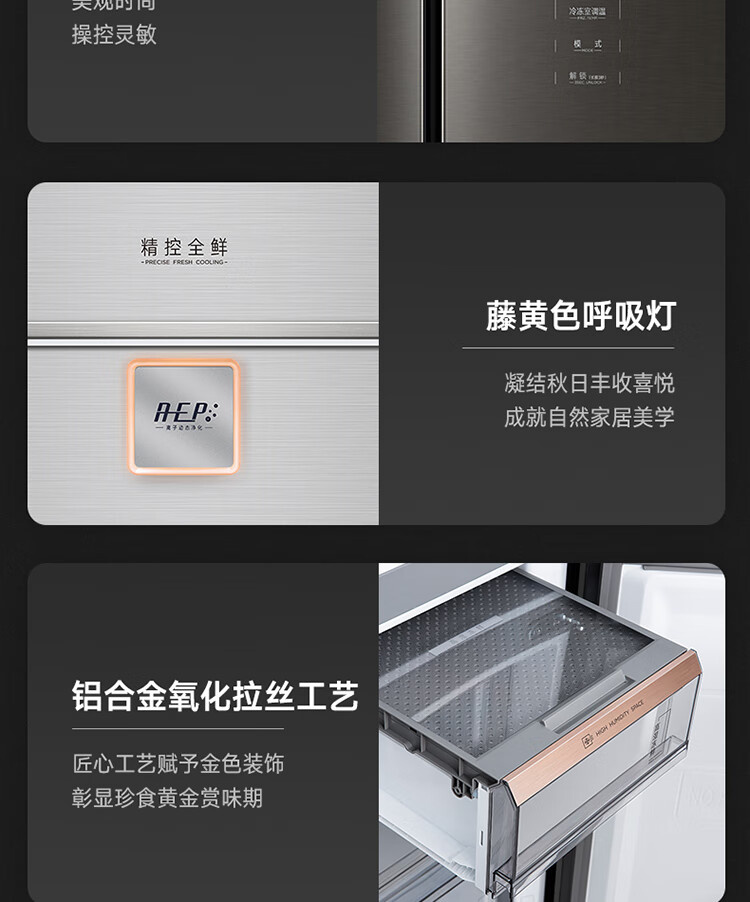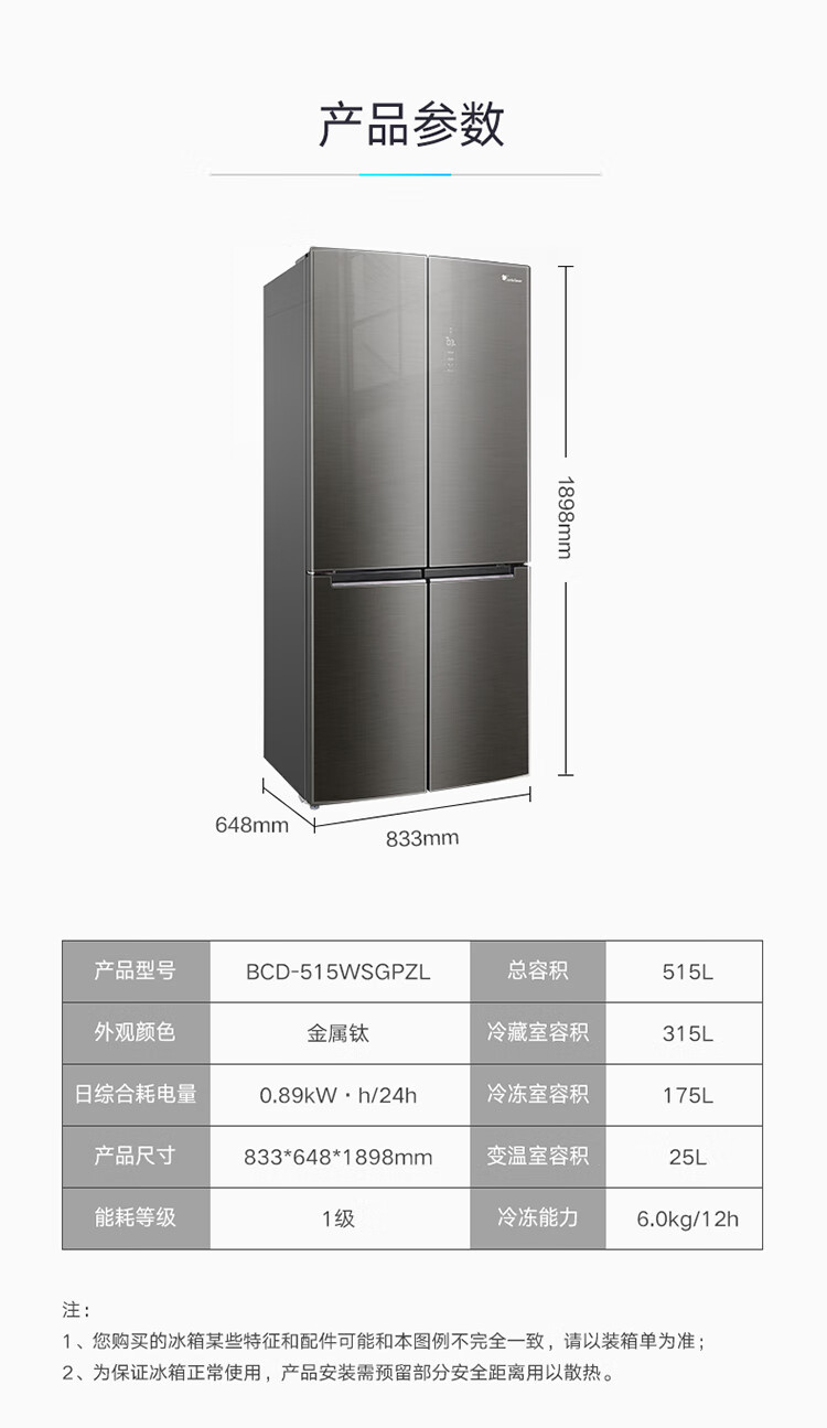 BCD-512WFGPZL 金属钛 512升 风冷无霜 变频 法式四门冰箱 1级能效 小天鹅(LitteSwan)