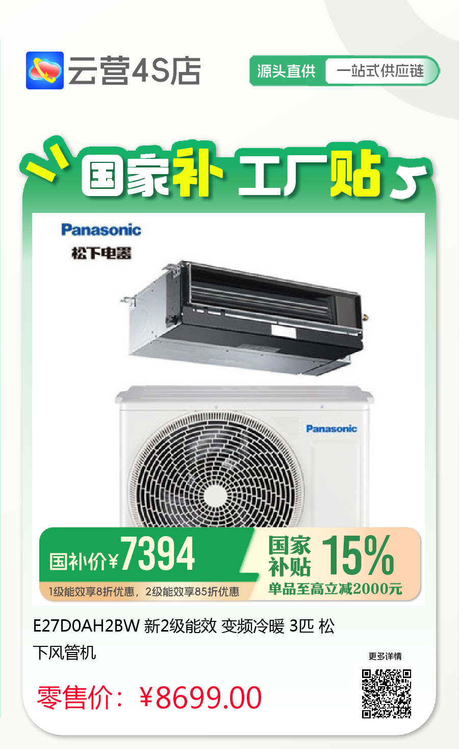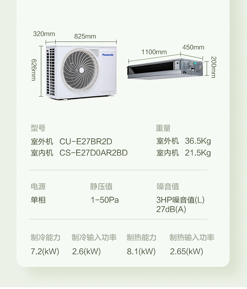 E27D0AH2BW 新2级能效 变频冷暖 3匹 松下风管机