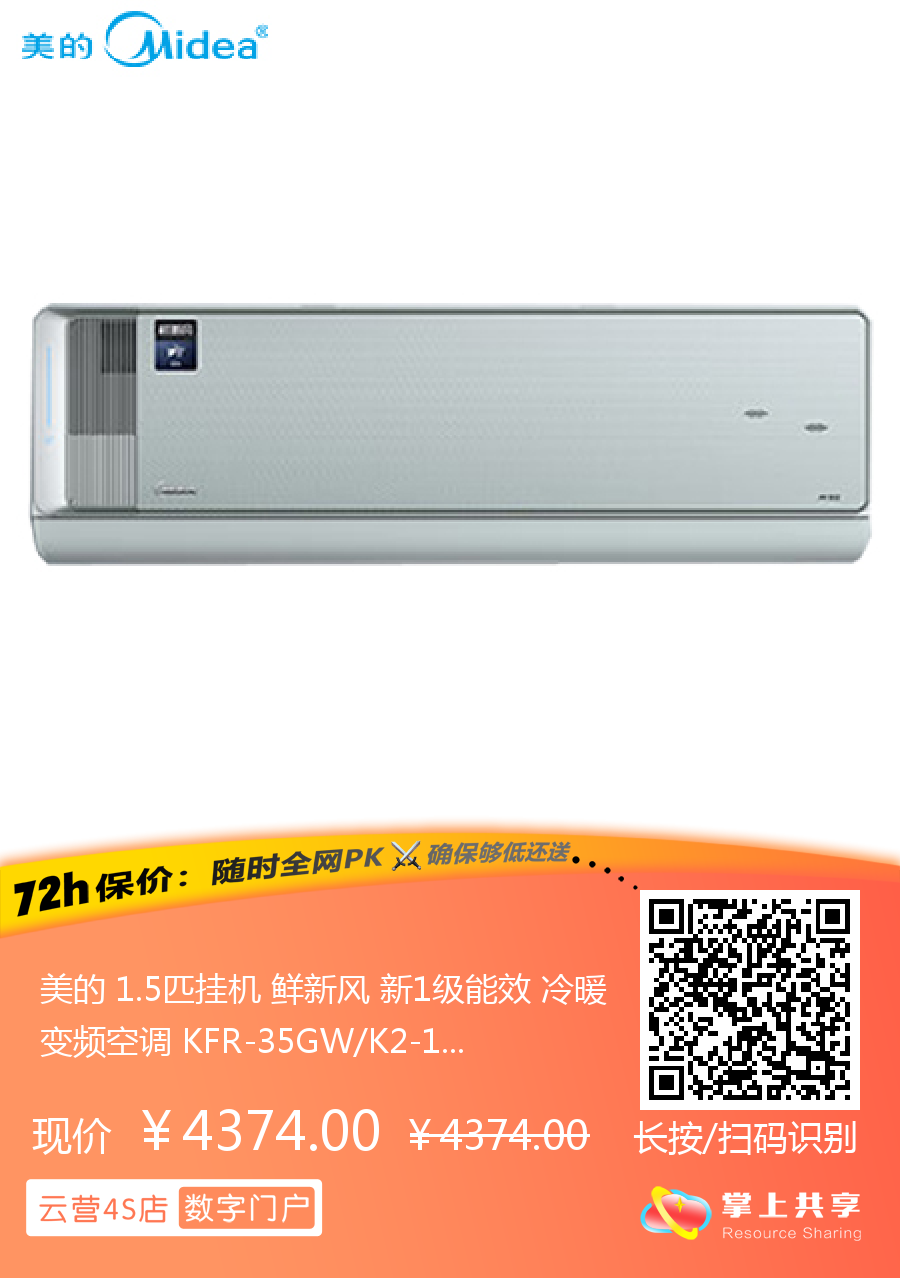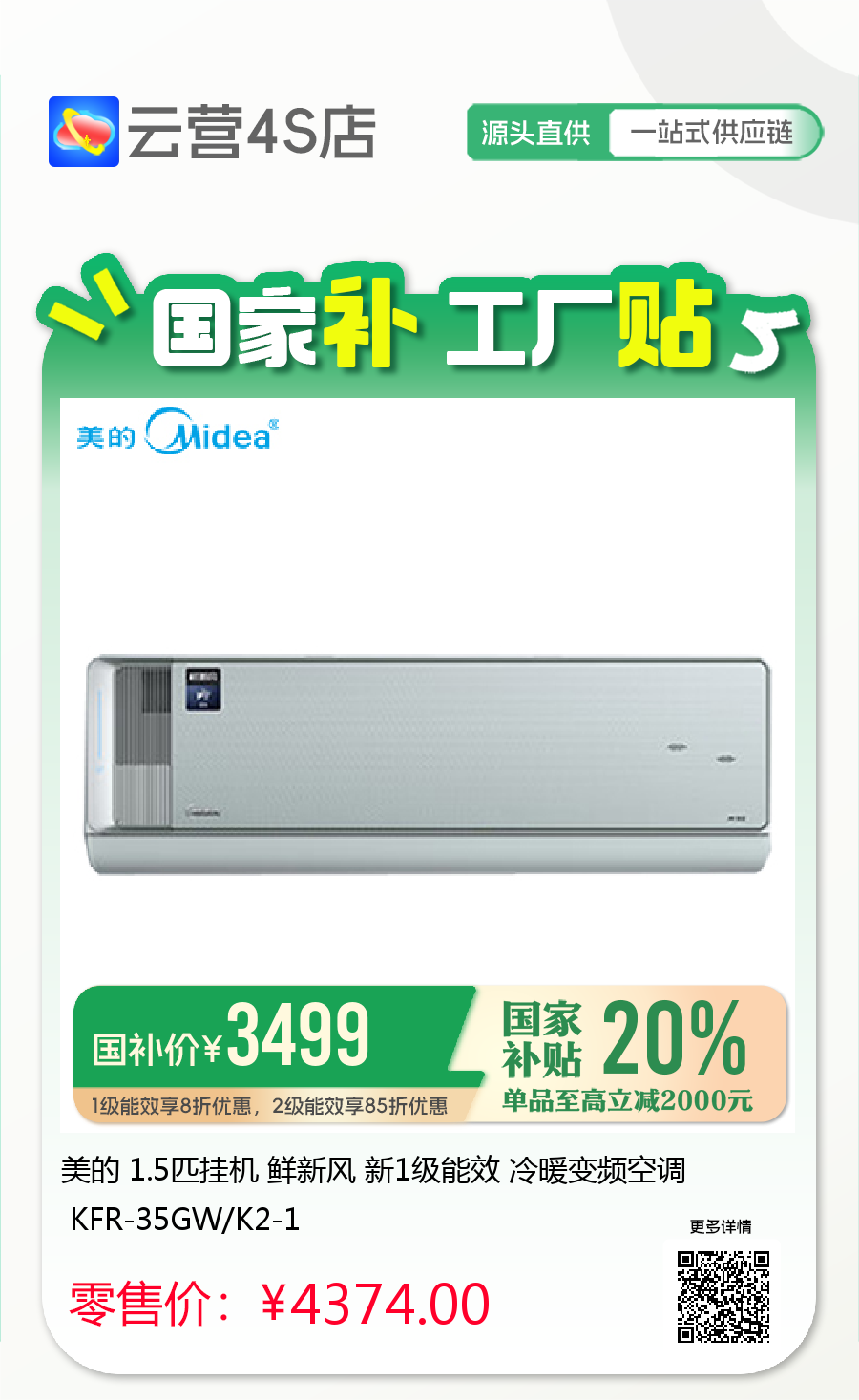 美的 1.5匹挂机 鲜新风 新1级能效 冷暖变频空调 KFR-35GW/K2-1