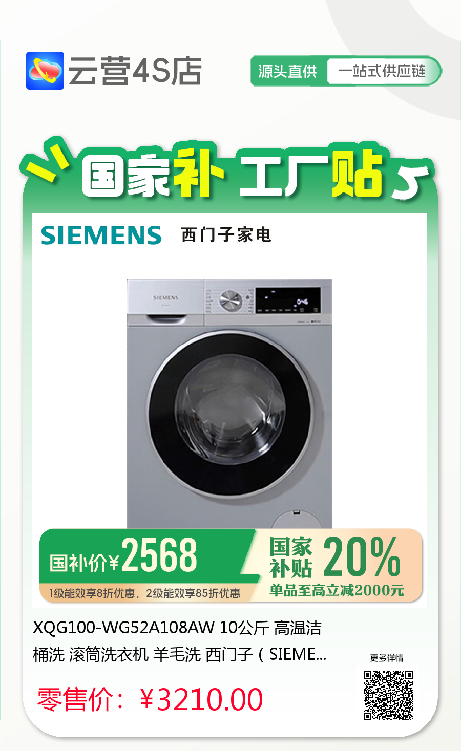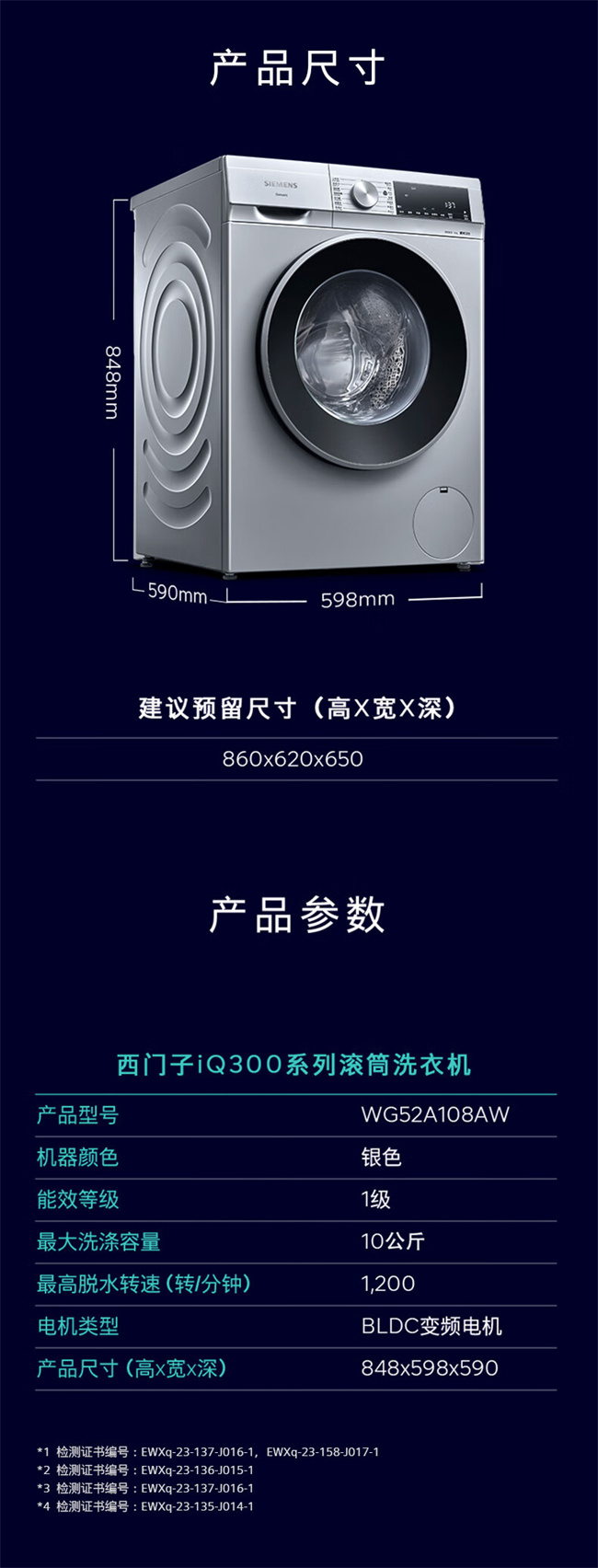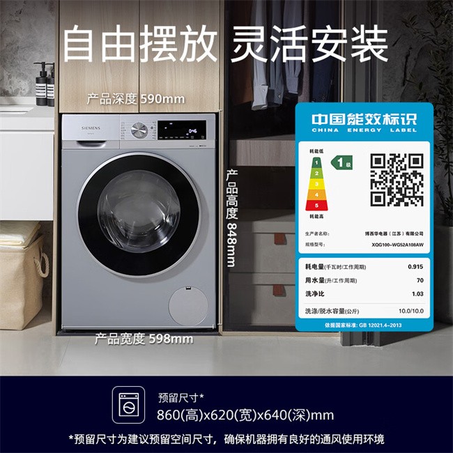 XQG100-WG52A108AW 10公斤 高温洁桶洗 滚筒洗衣机 羊毛洗 西门子(SIEMENS)