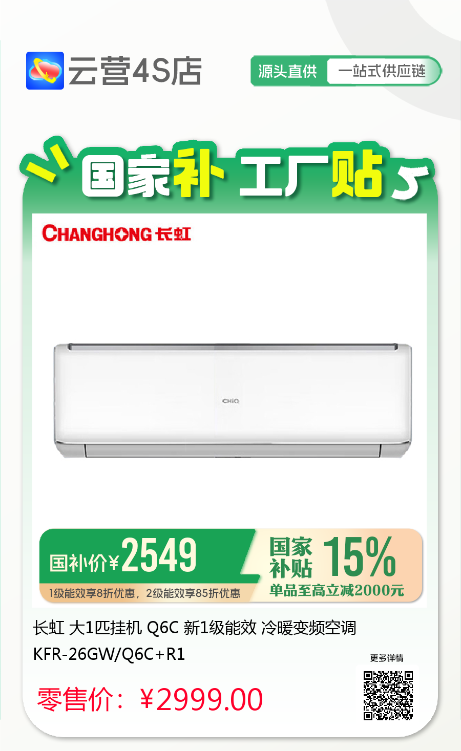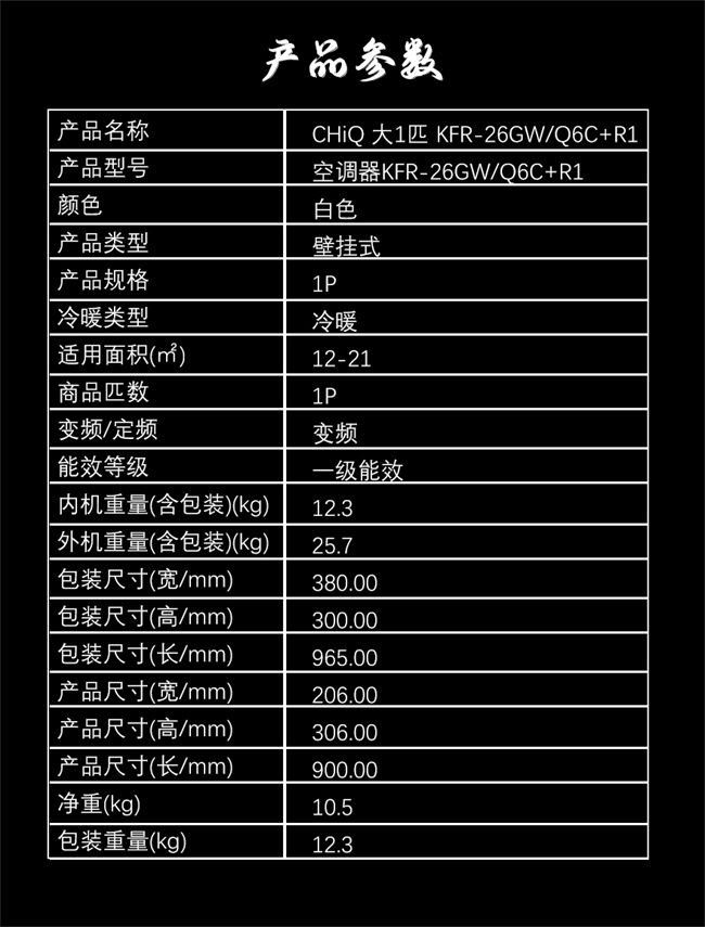 长虹 大1匹挂机 Q6C 新1级能效 冷暖变频空调 KFR-26GW/Q6C+R1