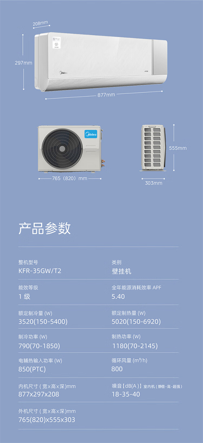 美的 1.5匹挂机 空气机T2 新1级能效 冷暖变频空调 KFR-35GW/T2
