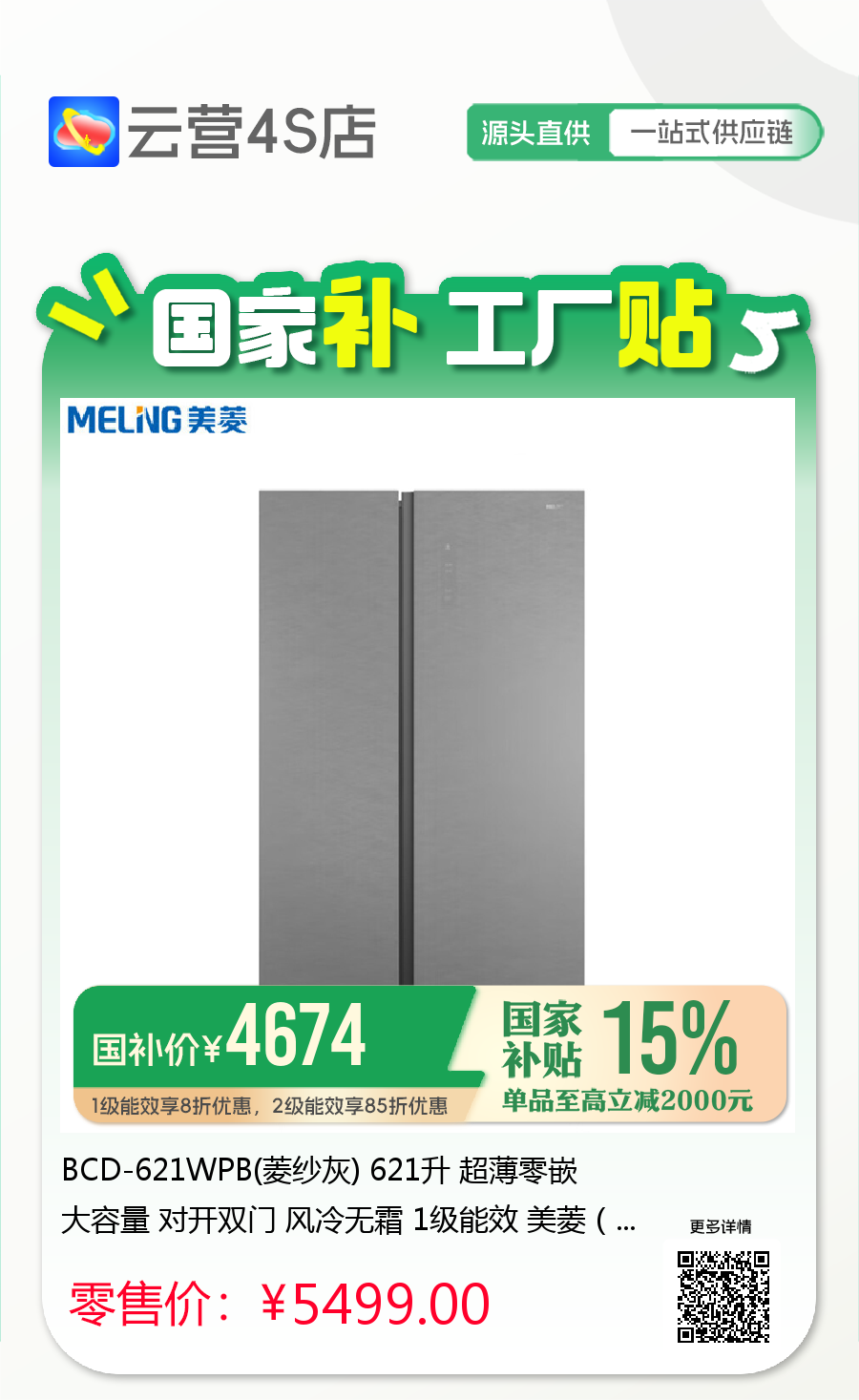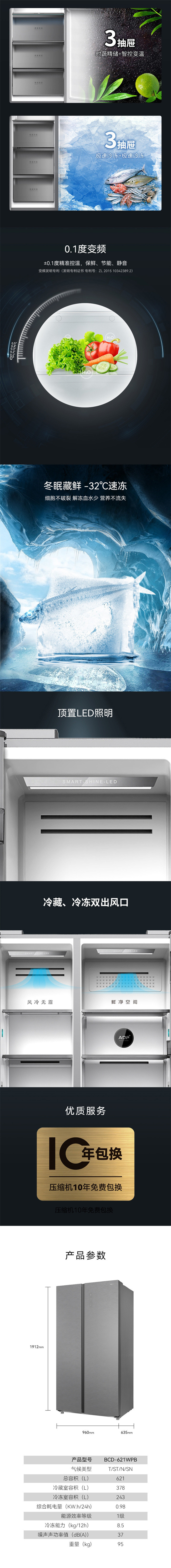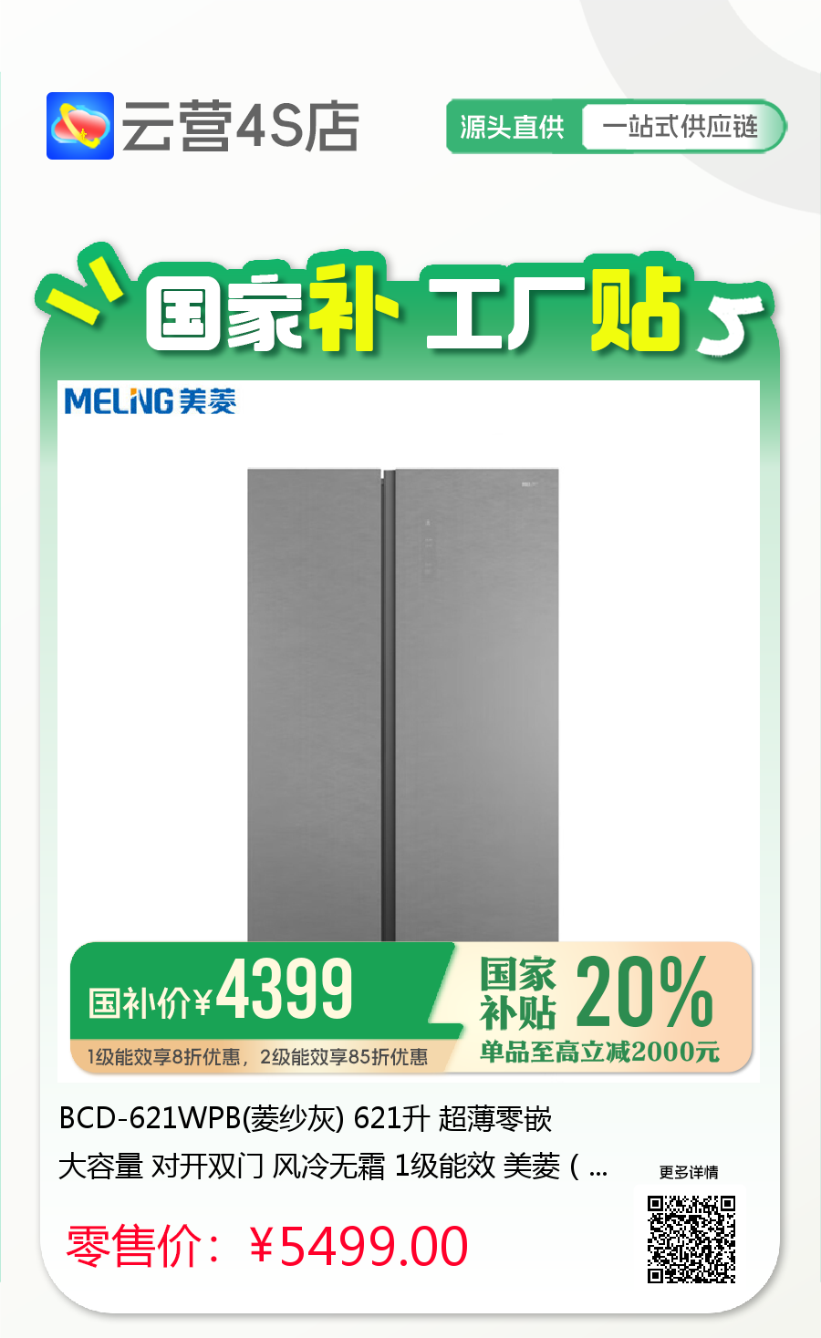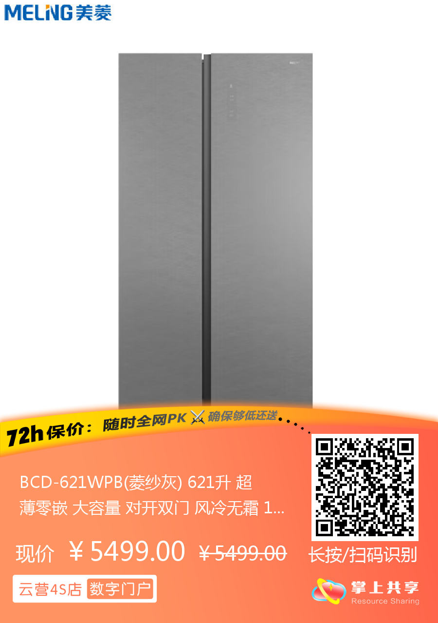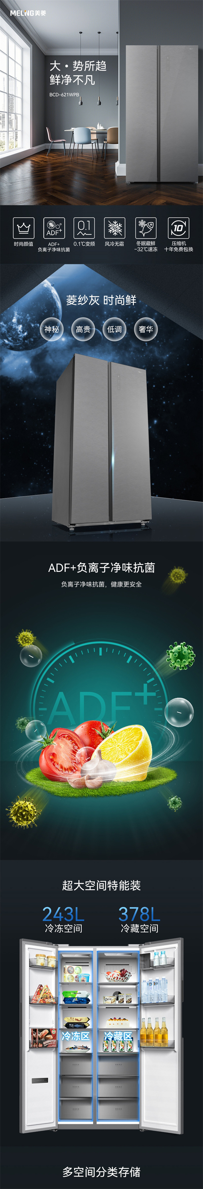 BCD-621WPB(菱纱灰) 621升 超薄零嵌 大容量 对开双门 风冷无霜 1级能效 美菱(MeiLing)