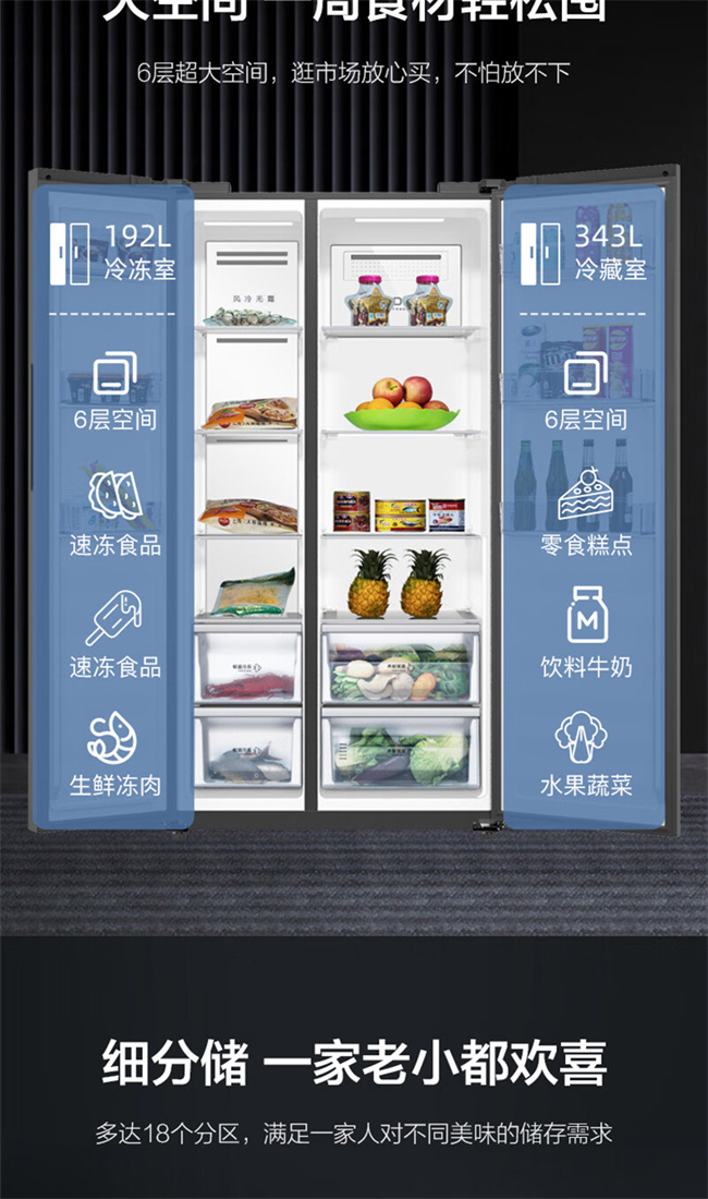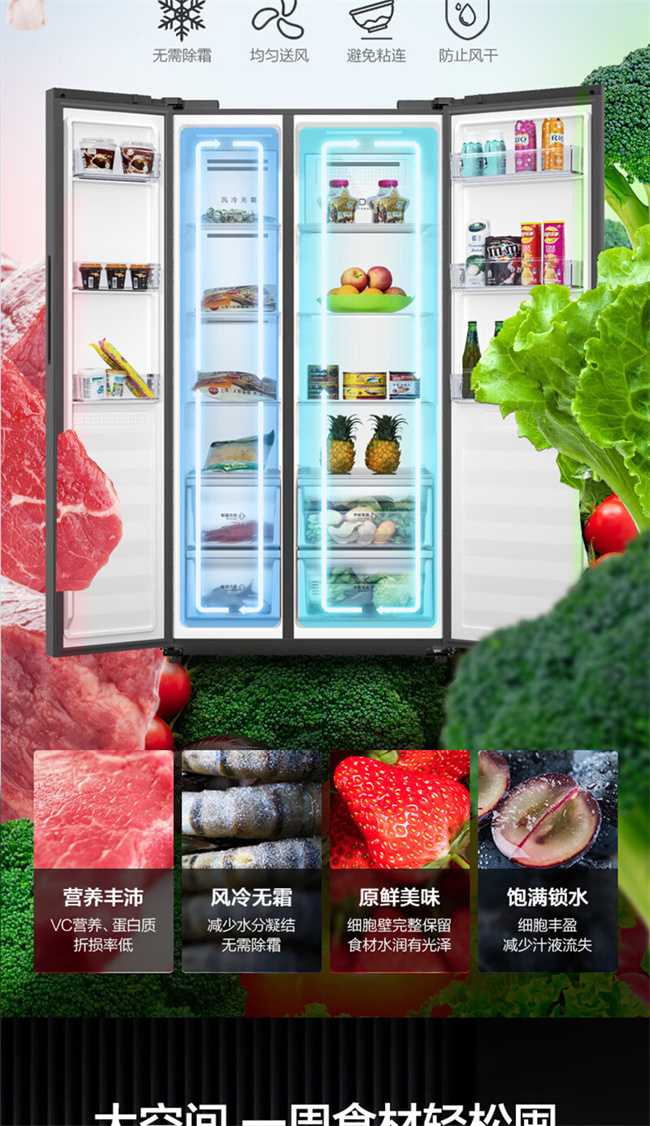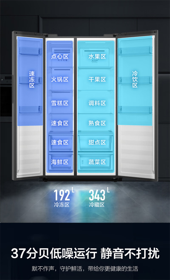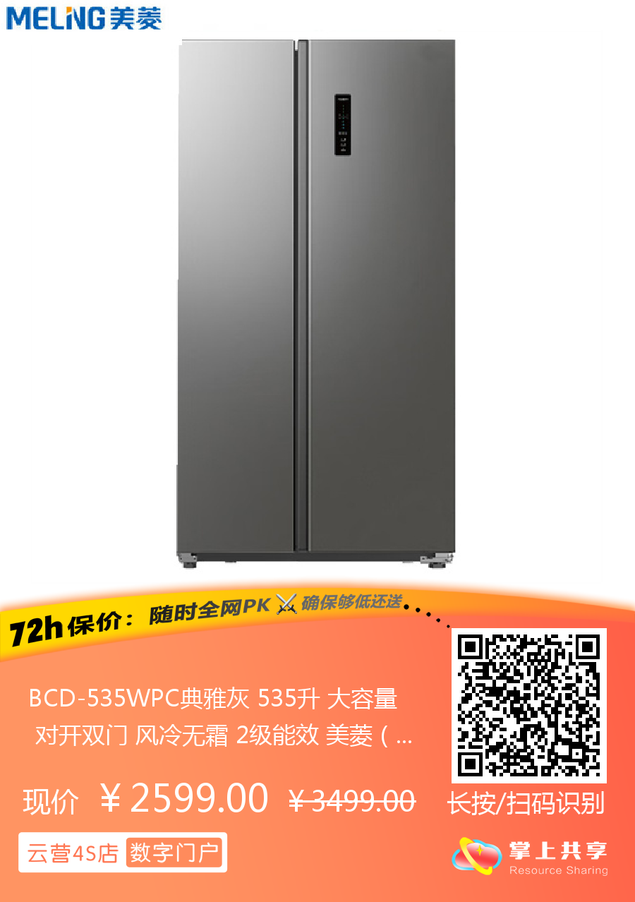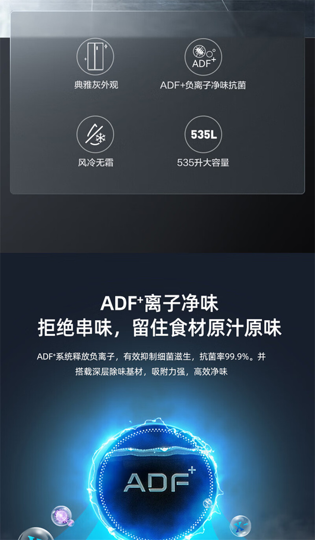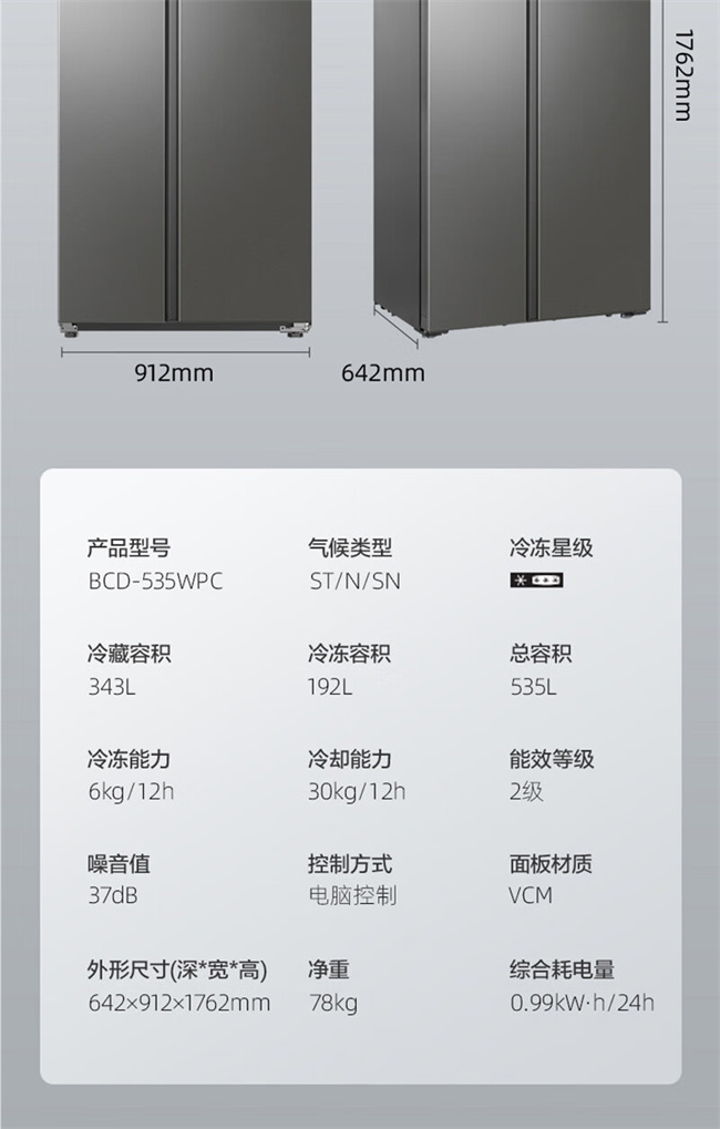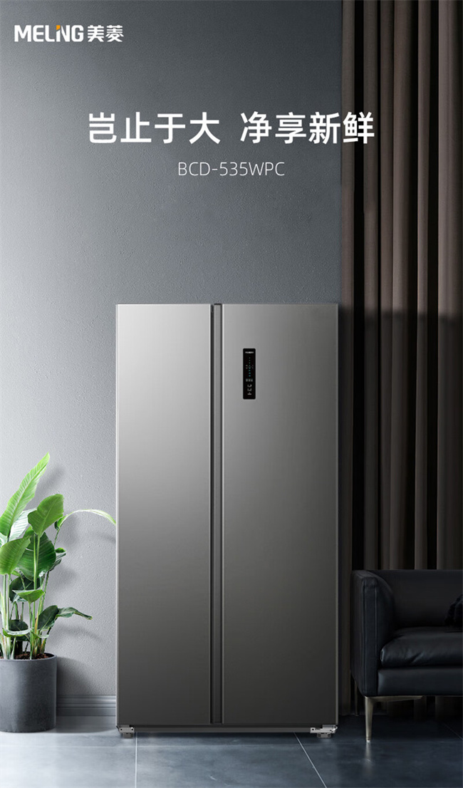 BCD-535WPC典雅灰 535升 大容量 对开双门 风冷无霜 2级能效 美菱(MeiLing)