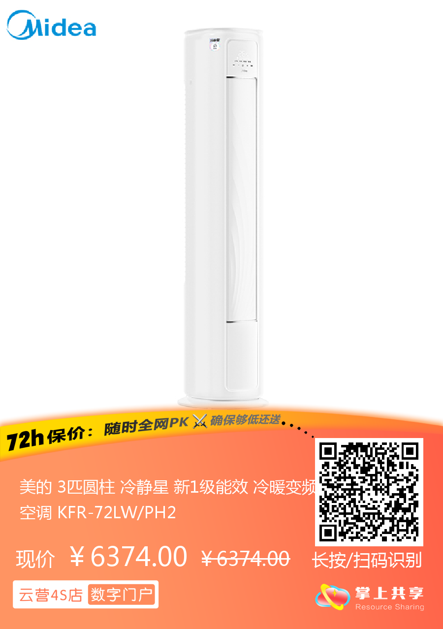 美的 3匹圆柱 冷静星 新1级能效 冷暖变频空调 KFR-72LW/PH2