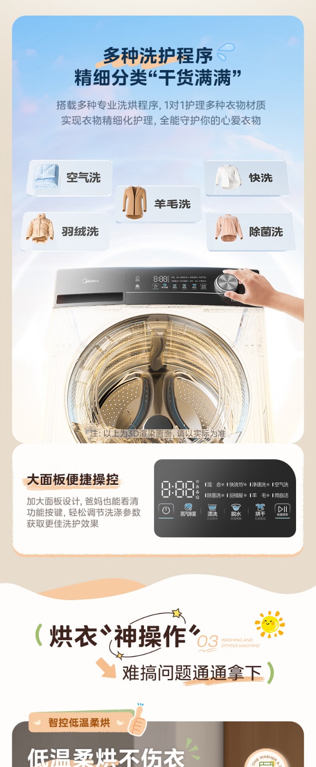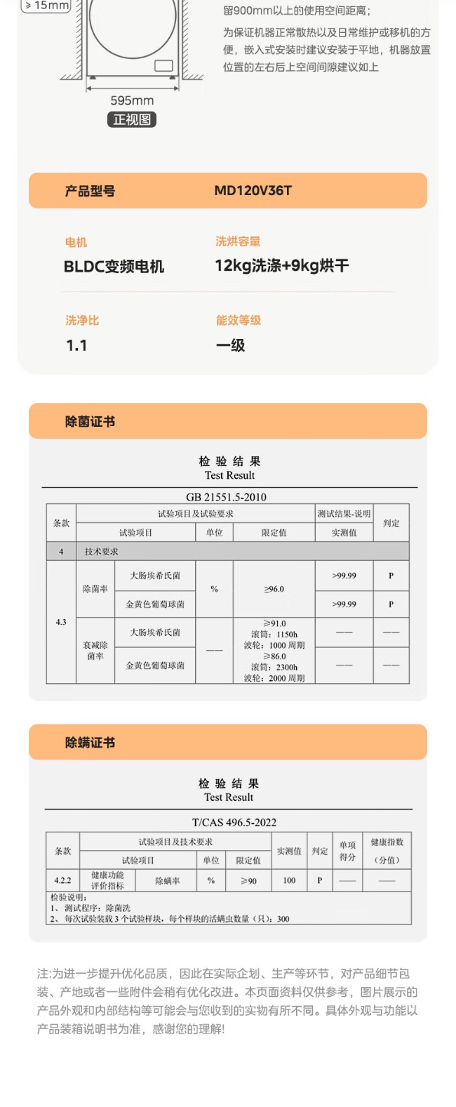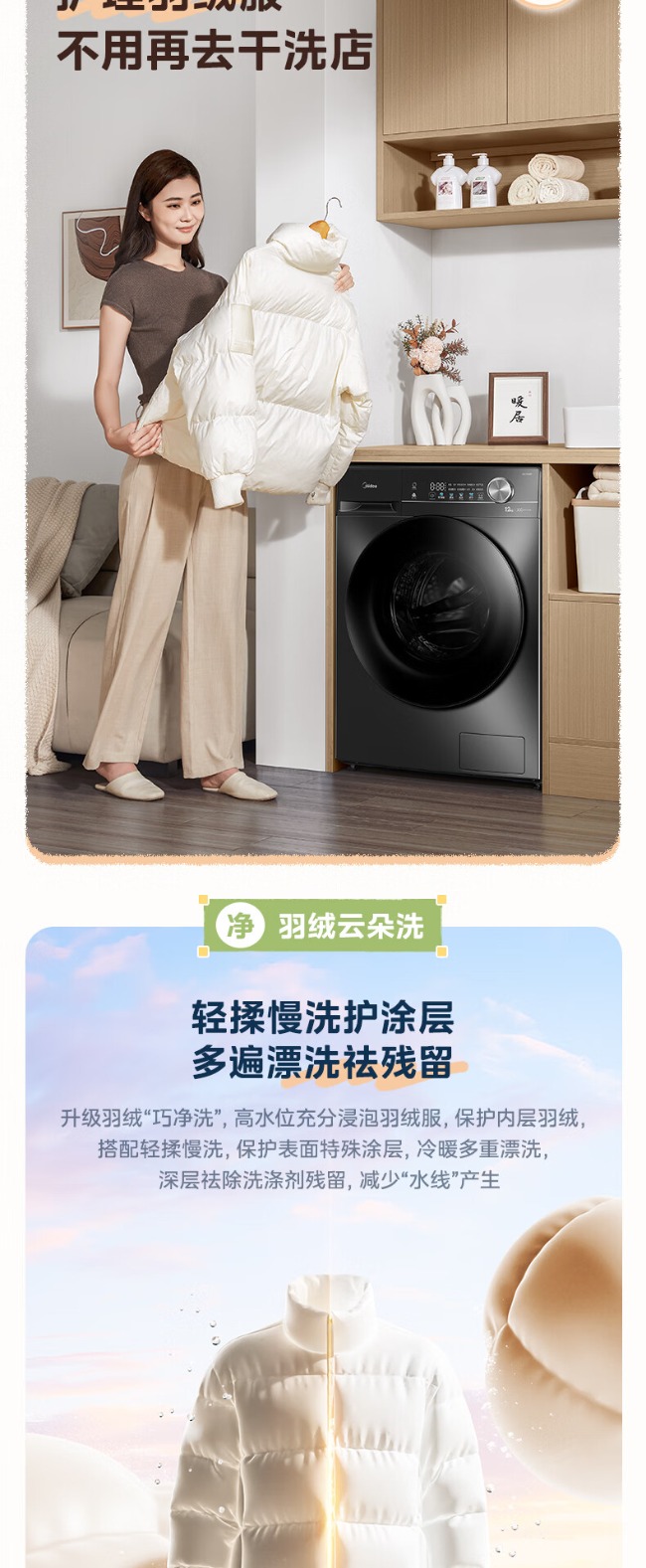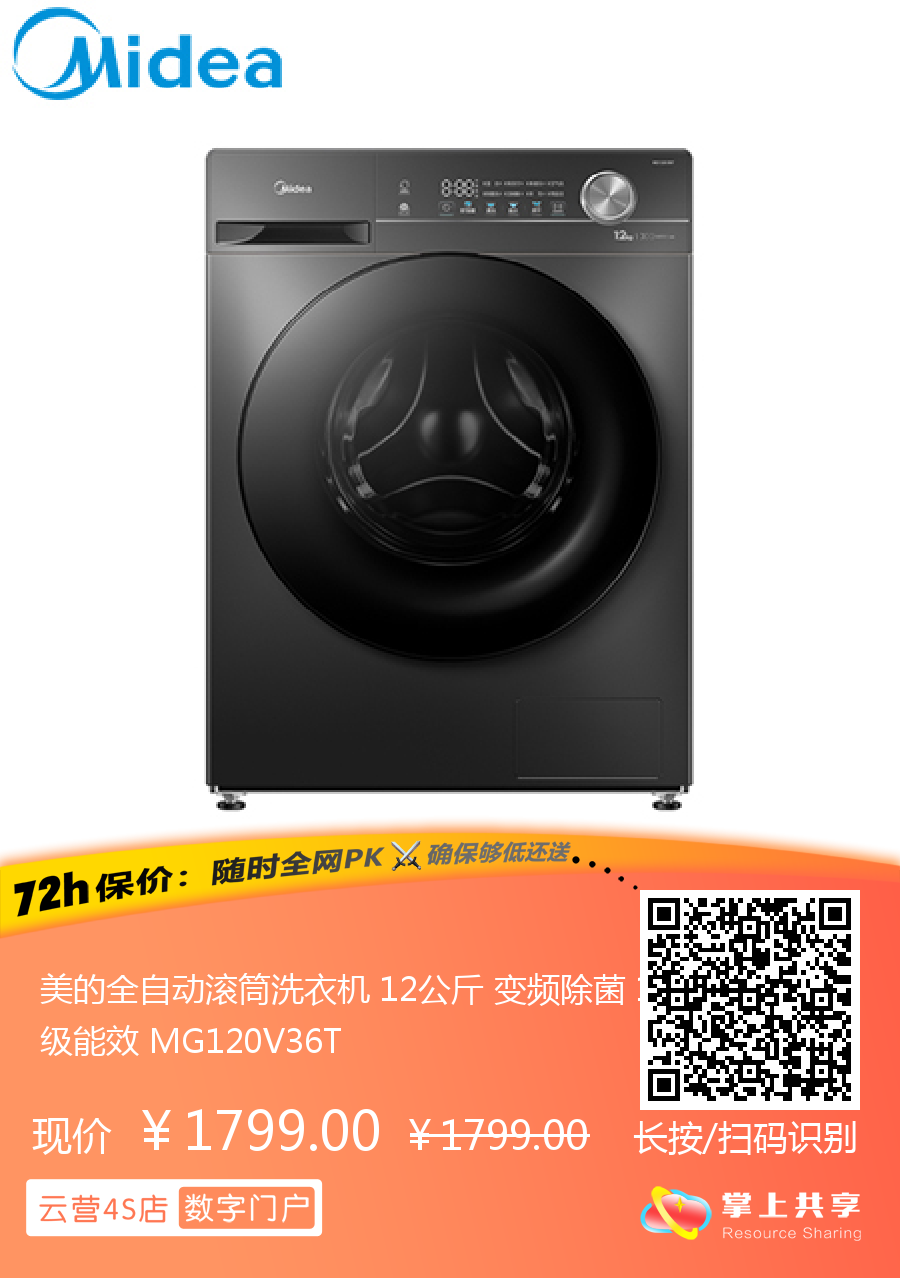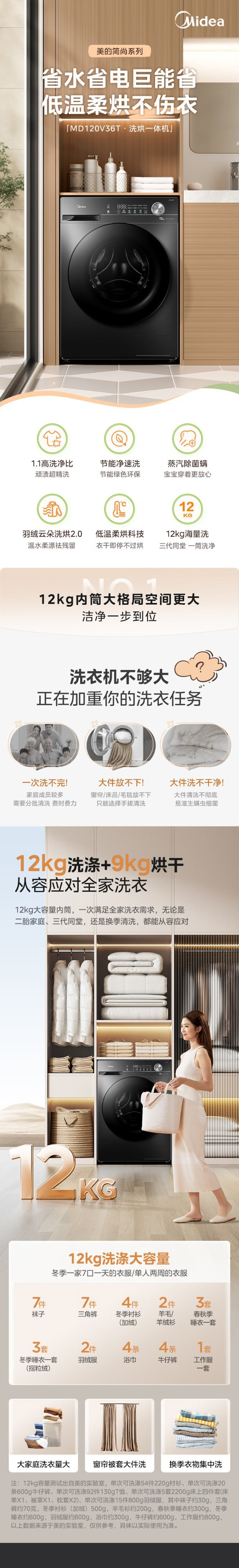 美的全自动滚筒洗衣机 12公斤 变频除菌 1级能效 MG120V36T