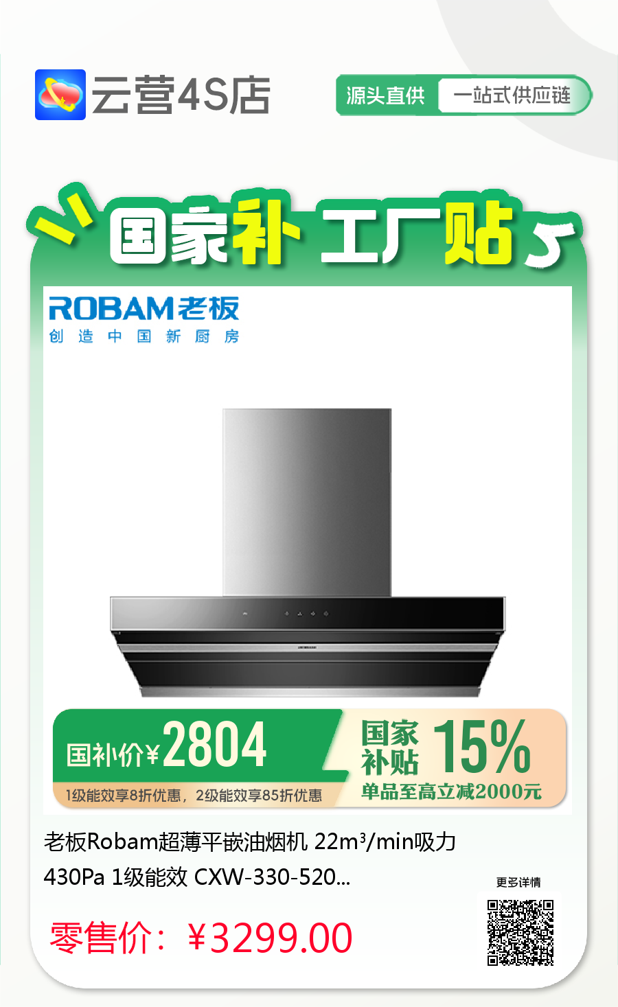老板Robam超薄平嵌油烟机 22m³/min吸力 430Pa 1级能效 CXW-330-5201