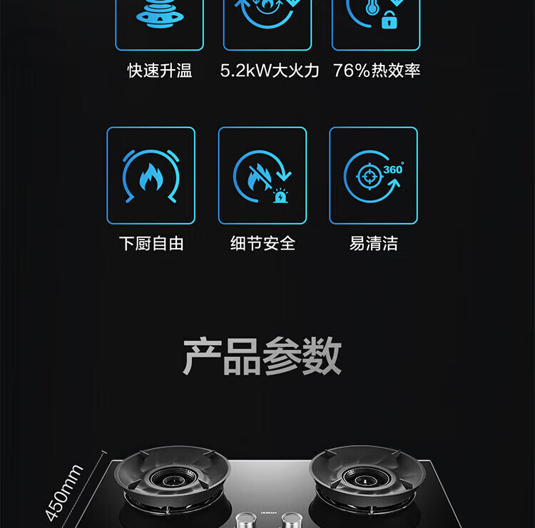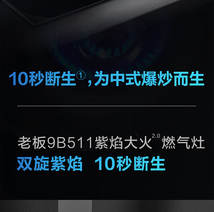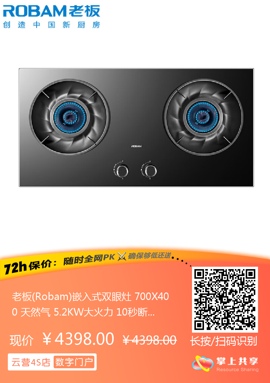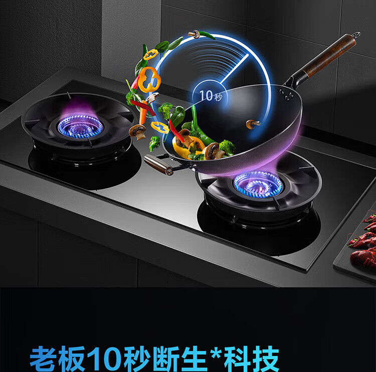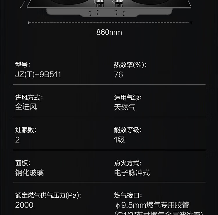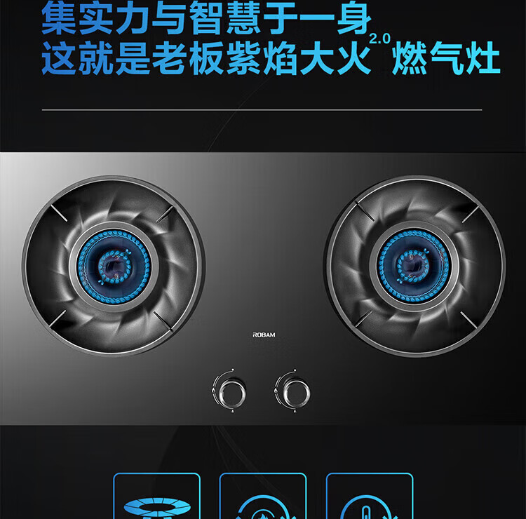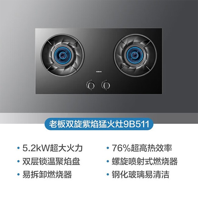 老板(Robam)嵌入式双眼灶 700X400 天然气 5.2KW大火力 10秒断生 1级能效 9B511