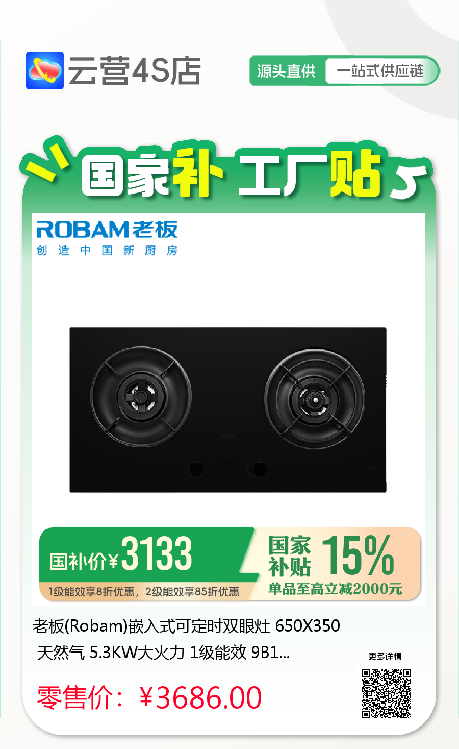 老板(Robam)嵌入式可定时双眼灶 650X350 天然气 5.3KW大火力 1级能效 9B1-i1黑