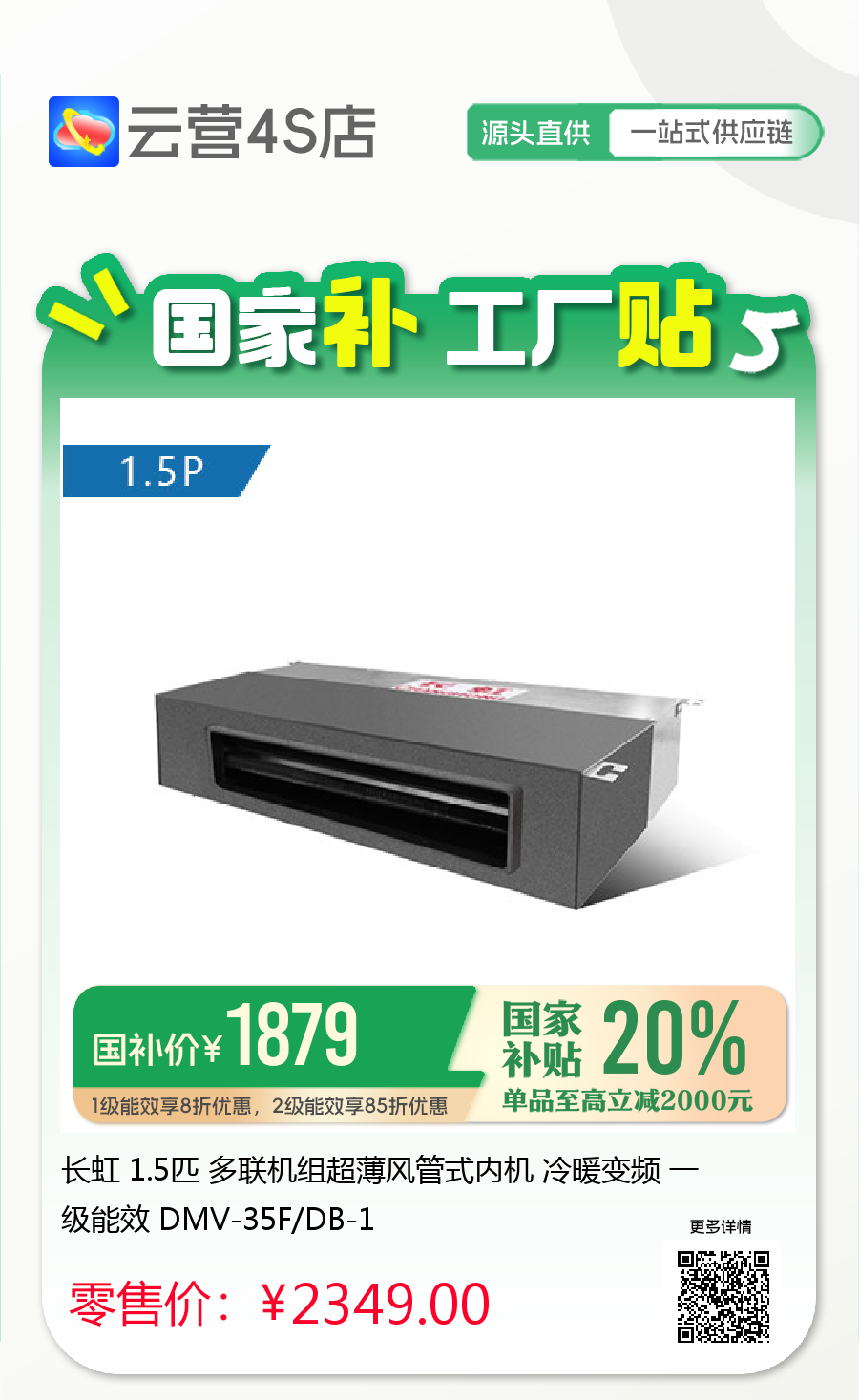 长虹 1.5匹 多联机组超薄风管式内机 冷暖变频 一级能效 DMV-35F/DB-1