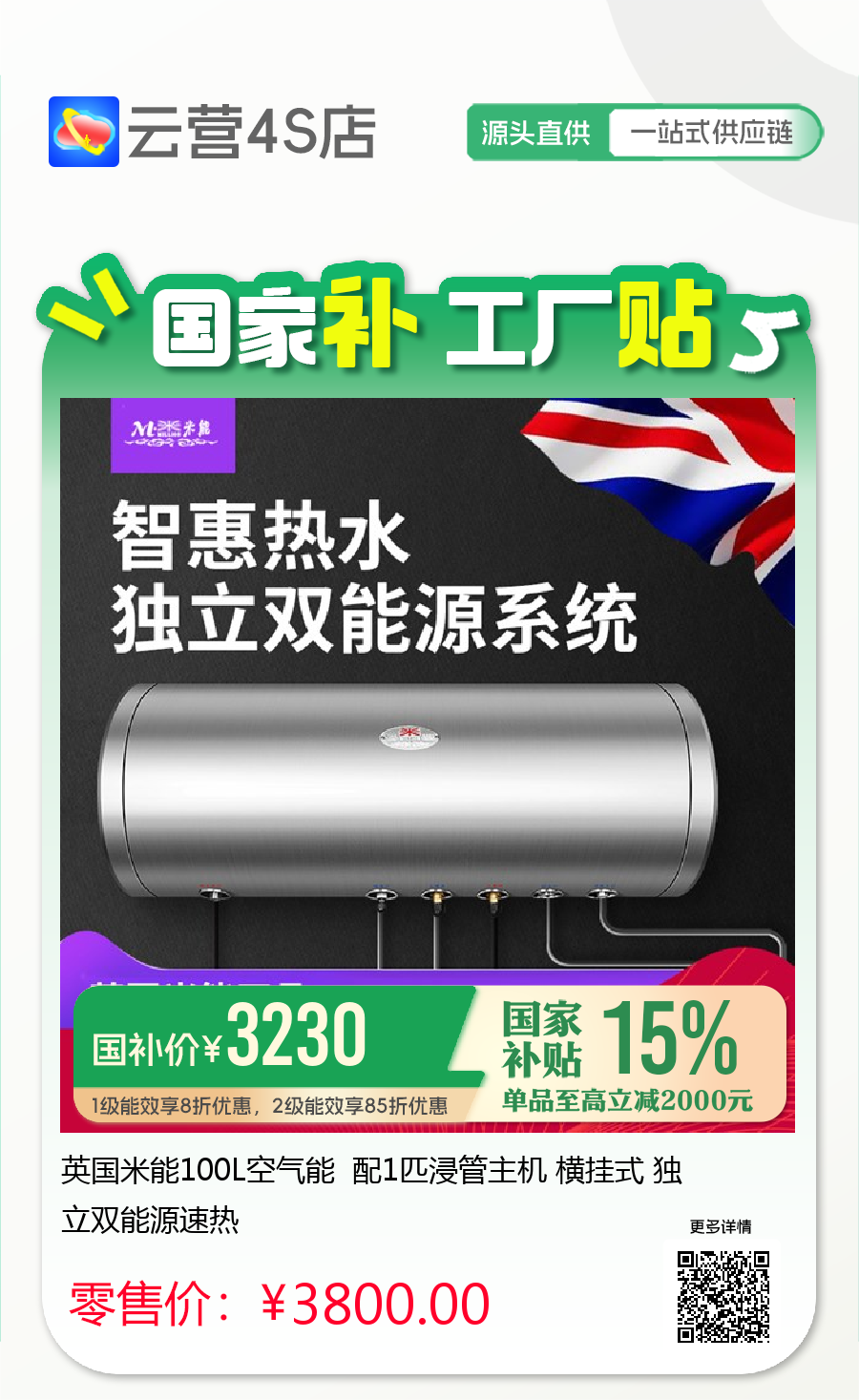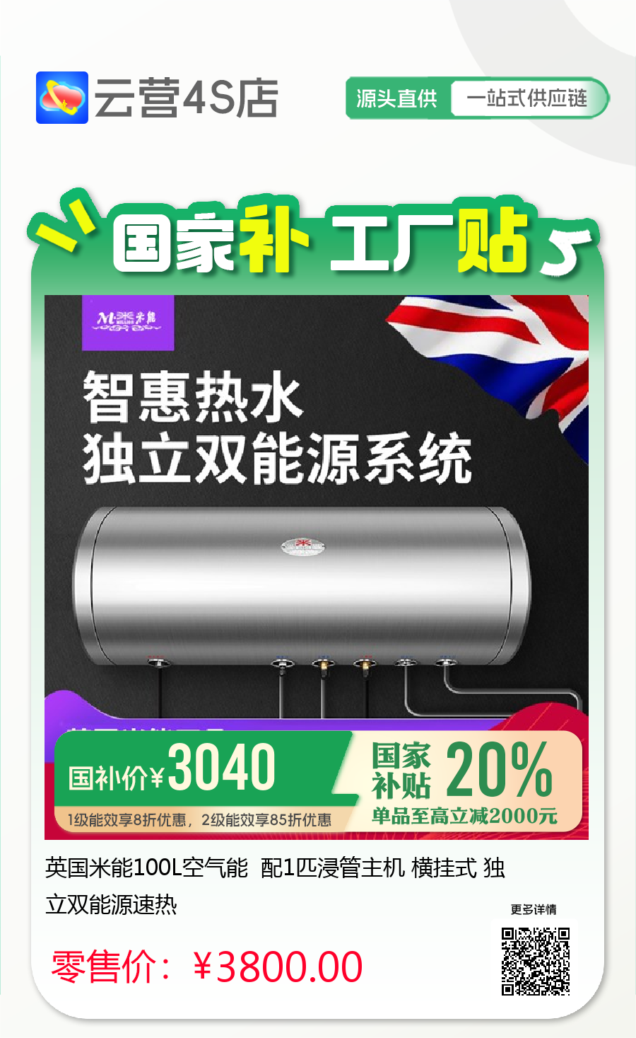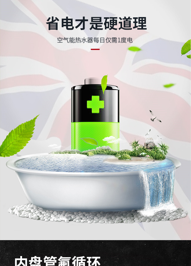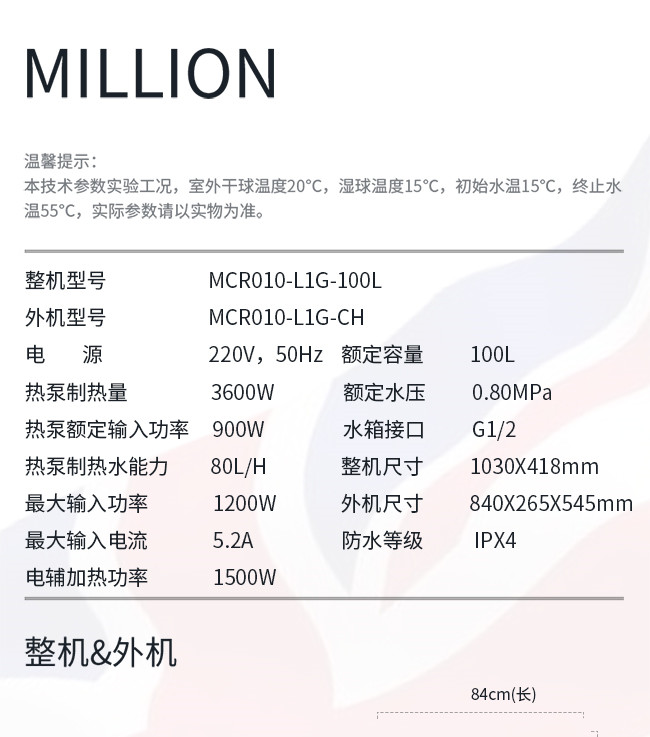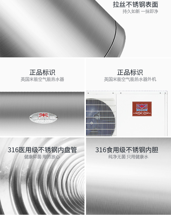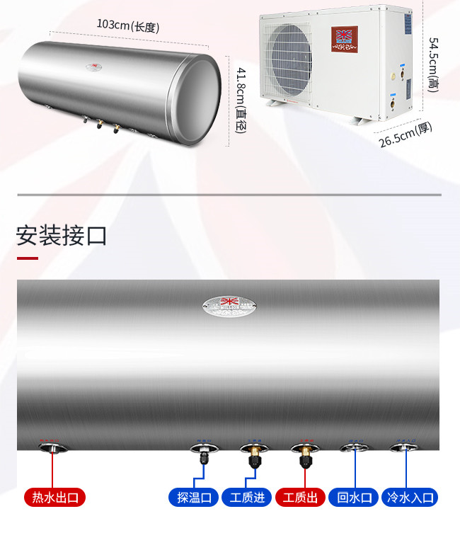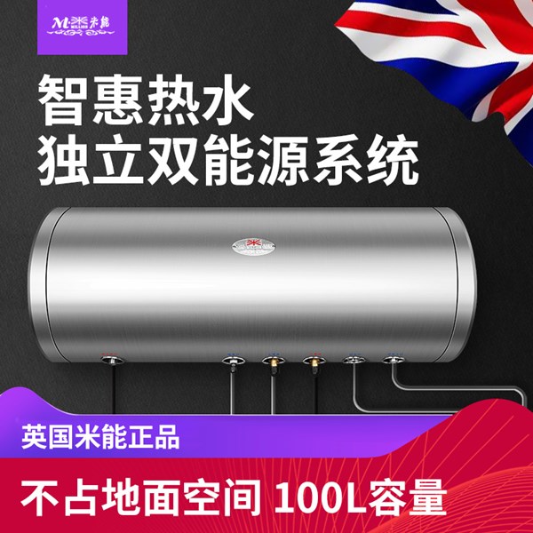 英国米能100L空气能 配1匹浸管主机 横挂式 独立双能源速热