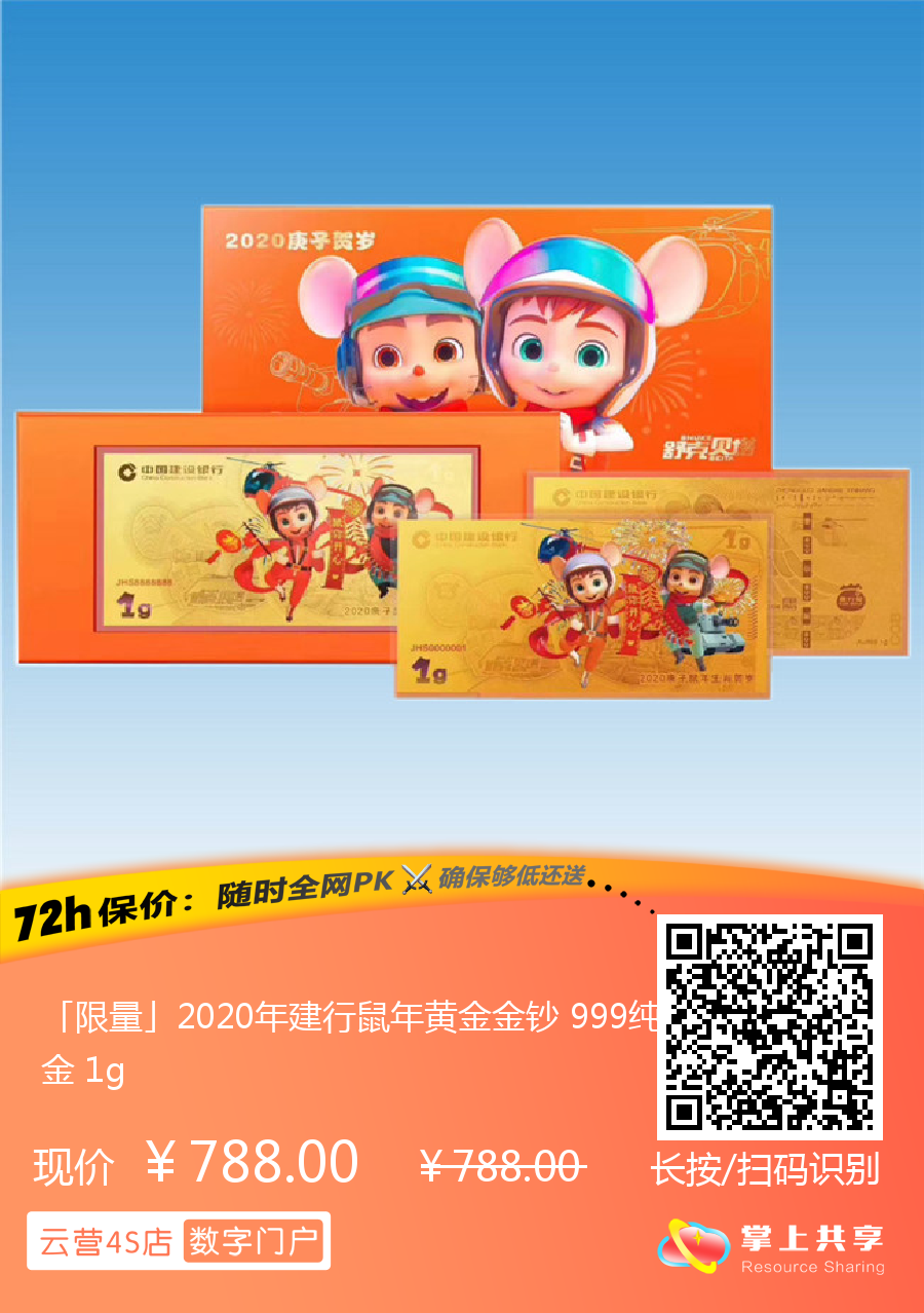 「限量」2020年建行鼠年黄金金钞 999纯金 1g