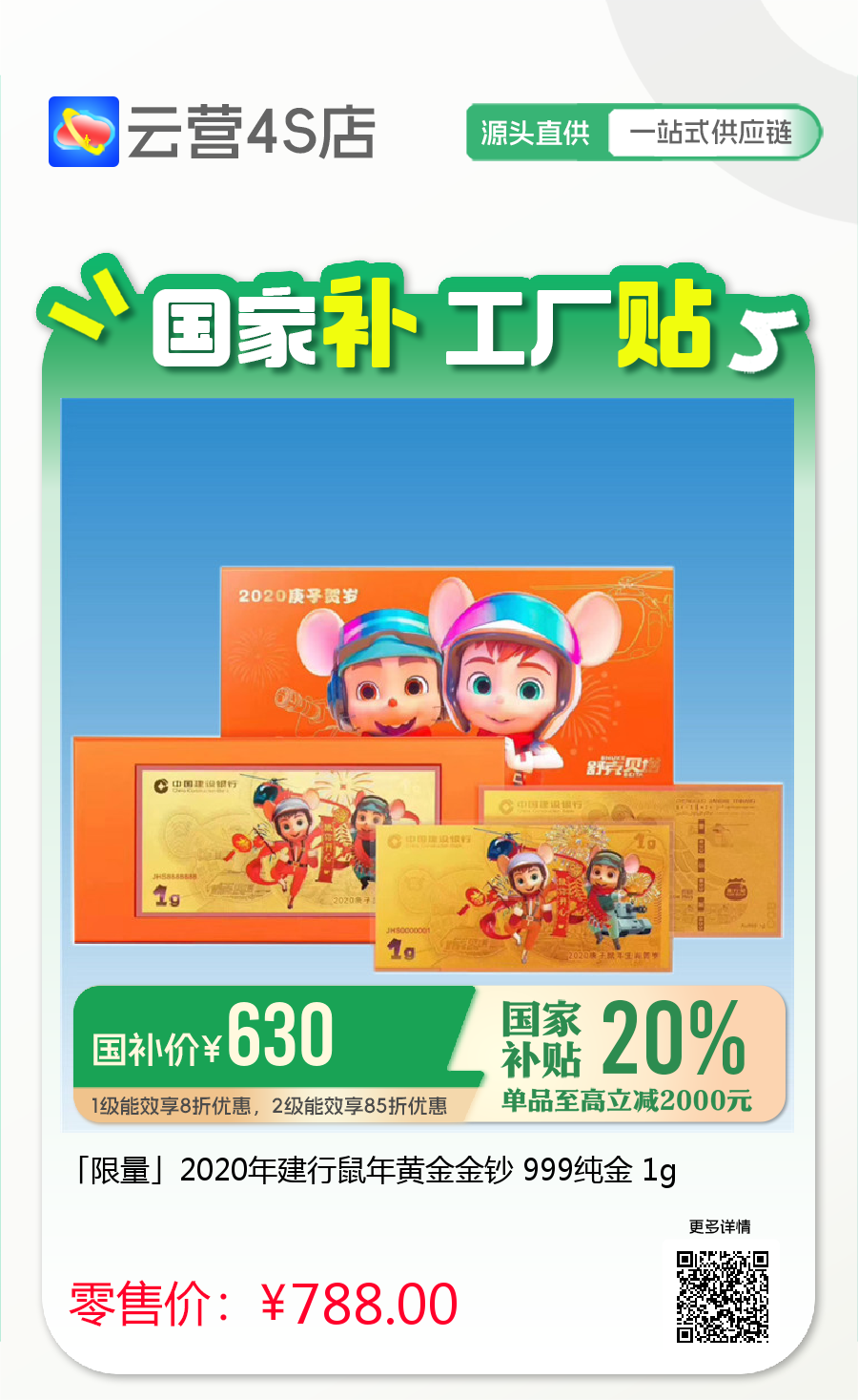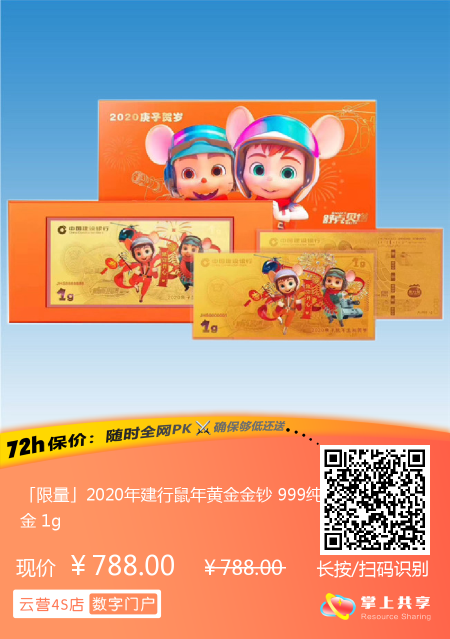 「限量」2020年建行鼠年黄金金钞 999纯金 1g