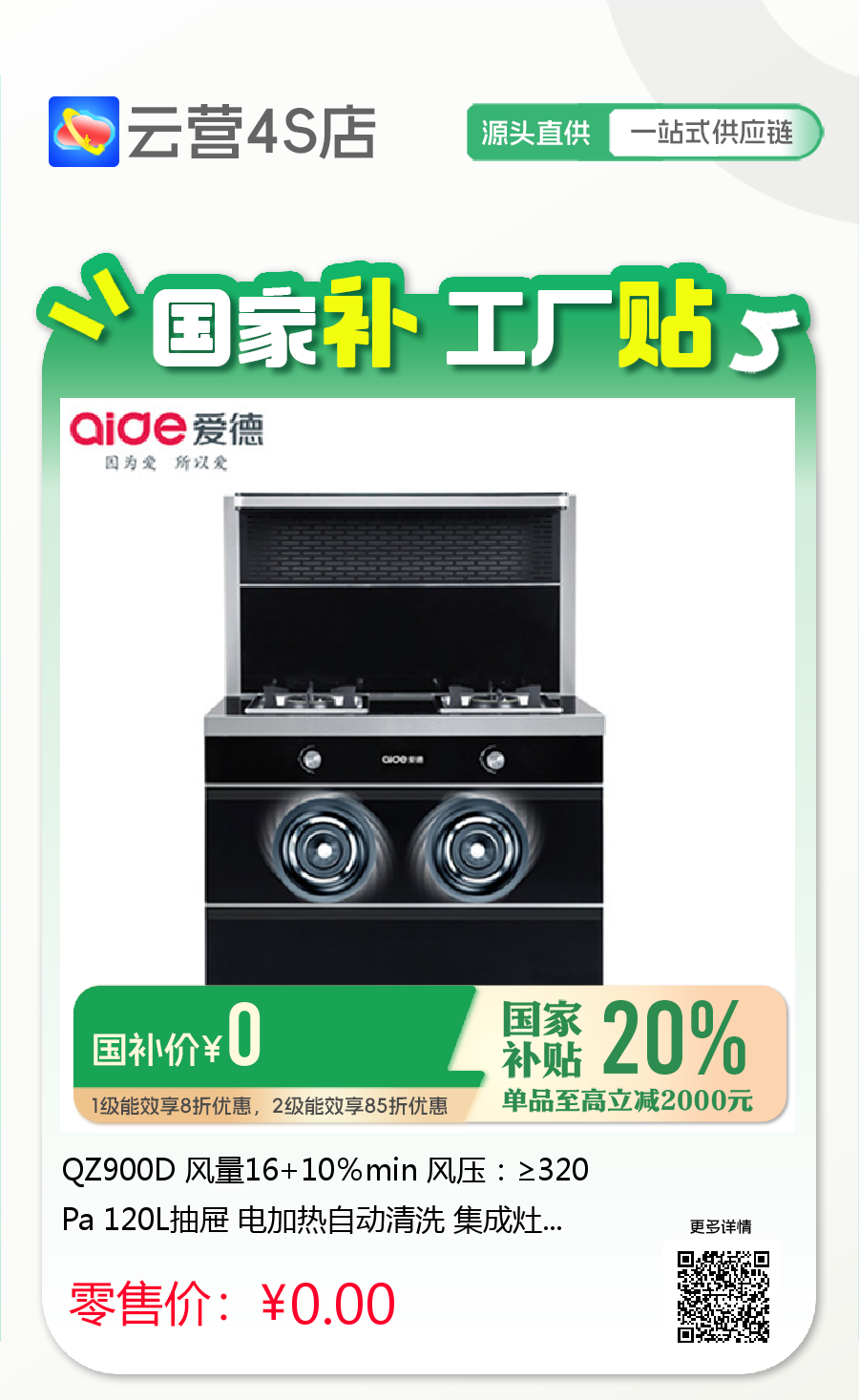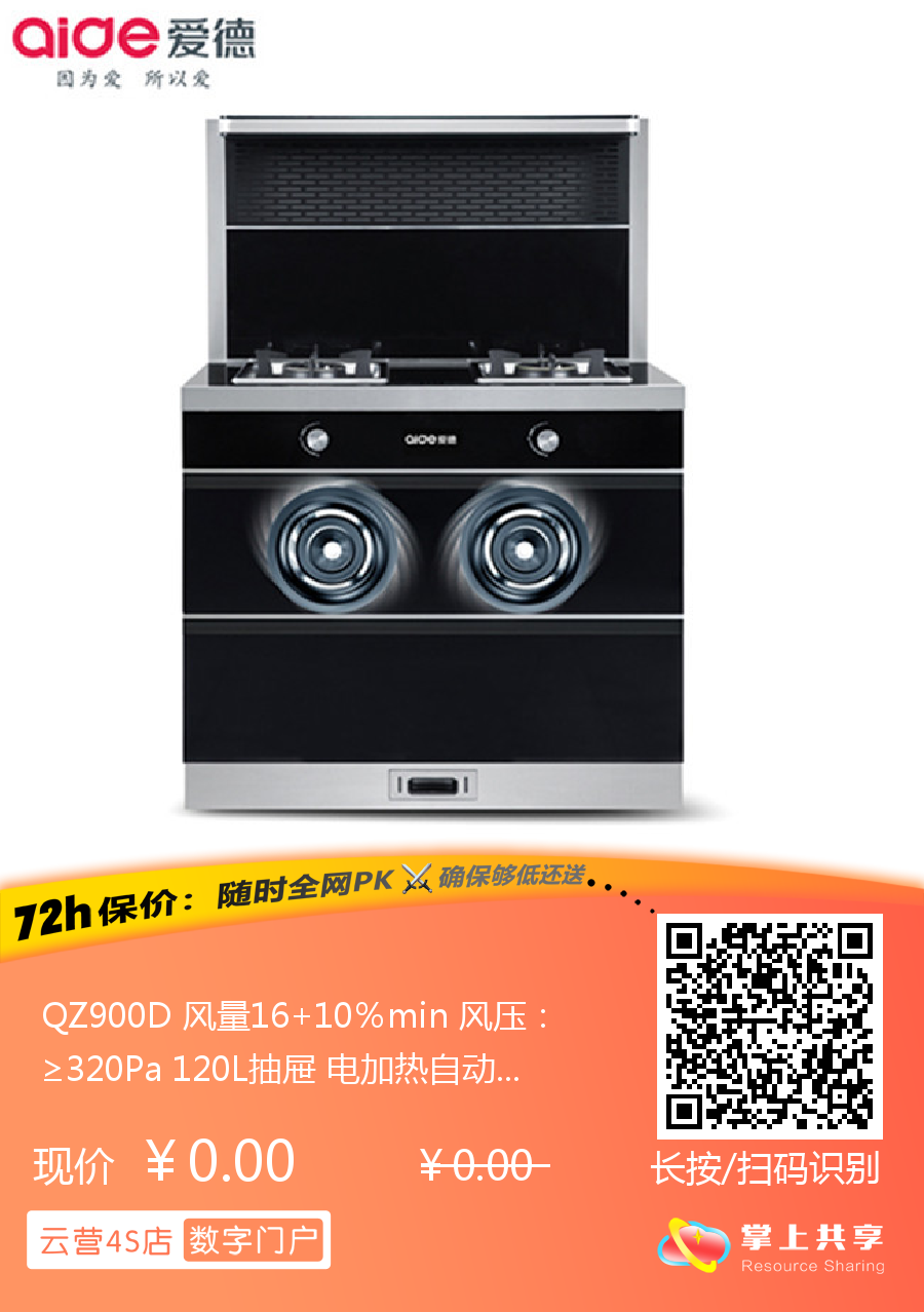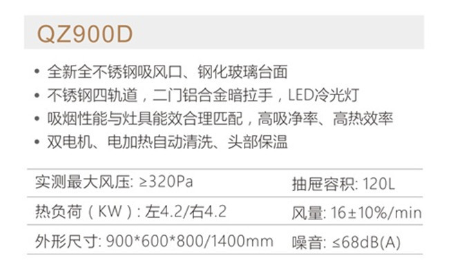 QZ900D 风量16+10%min 风压:≥320Pa 120L抽屉 电加热自动清洗 集成灶