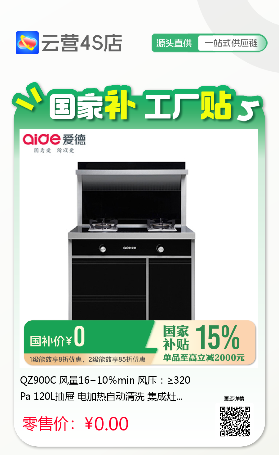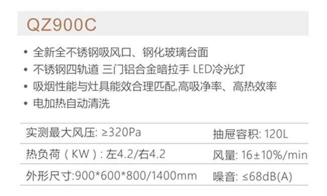 QZ900C 风量16+10%min 风压:≥320Pa 120L抽屉 电加热自动清洗 集成灶