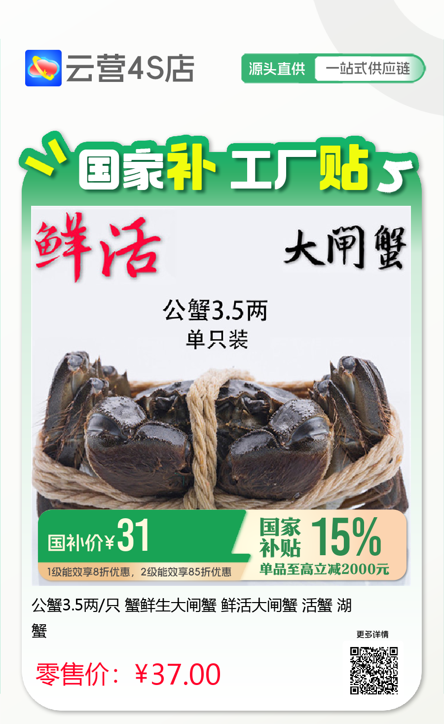 公蟹3.5两/只 蟹鲜生大闸蟹 鲜活大闸蟹 活蟹 湖蟹