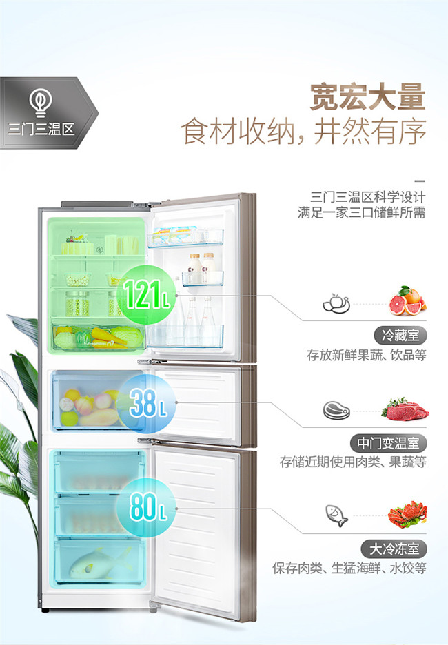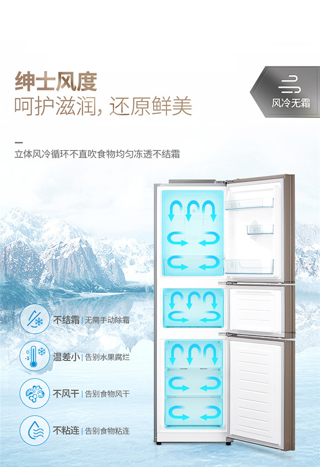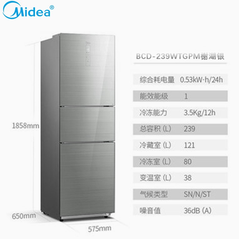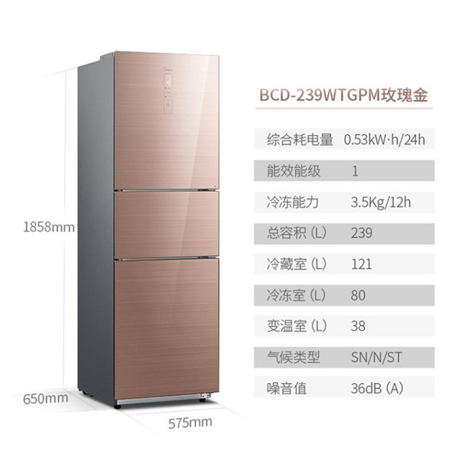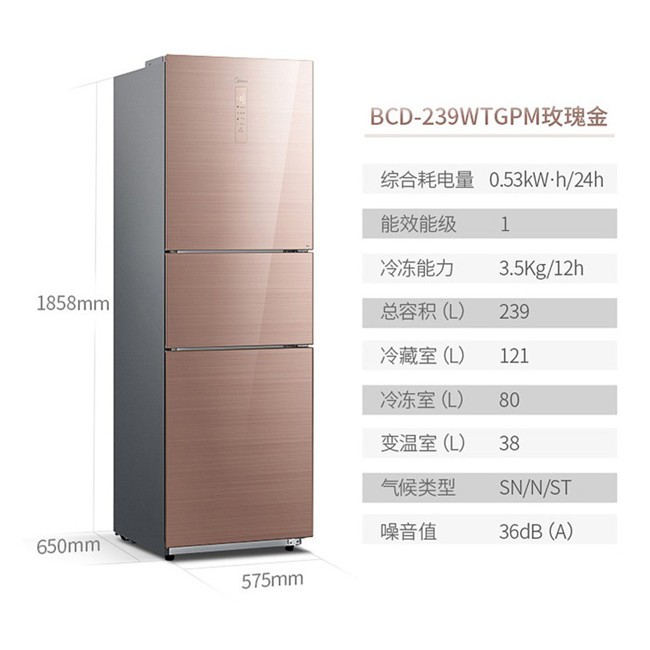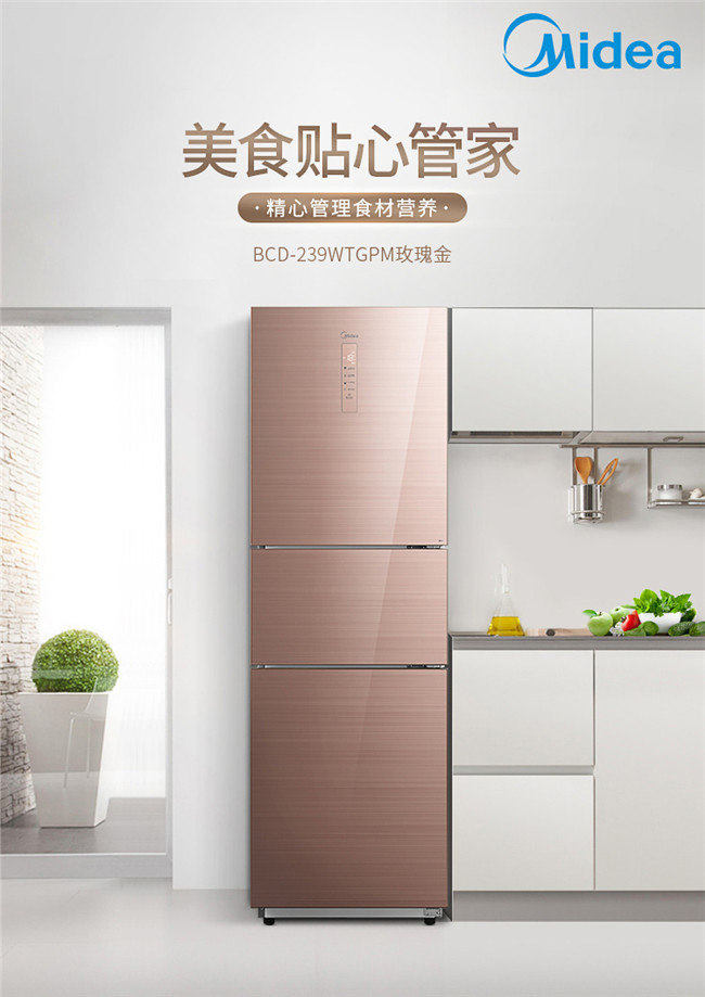 BCD-239WTGPM 239升 风冷无霜 变频 三门冰箱 2级能效 美的(Midea)