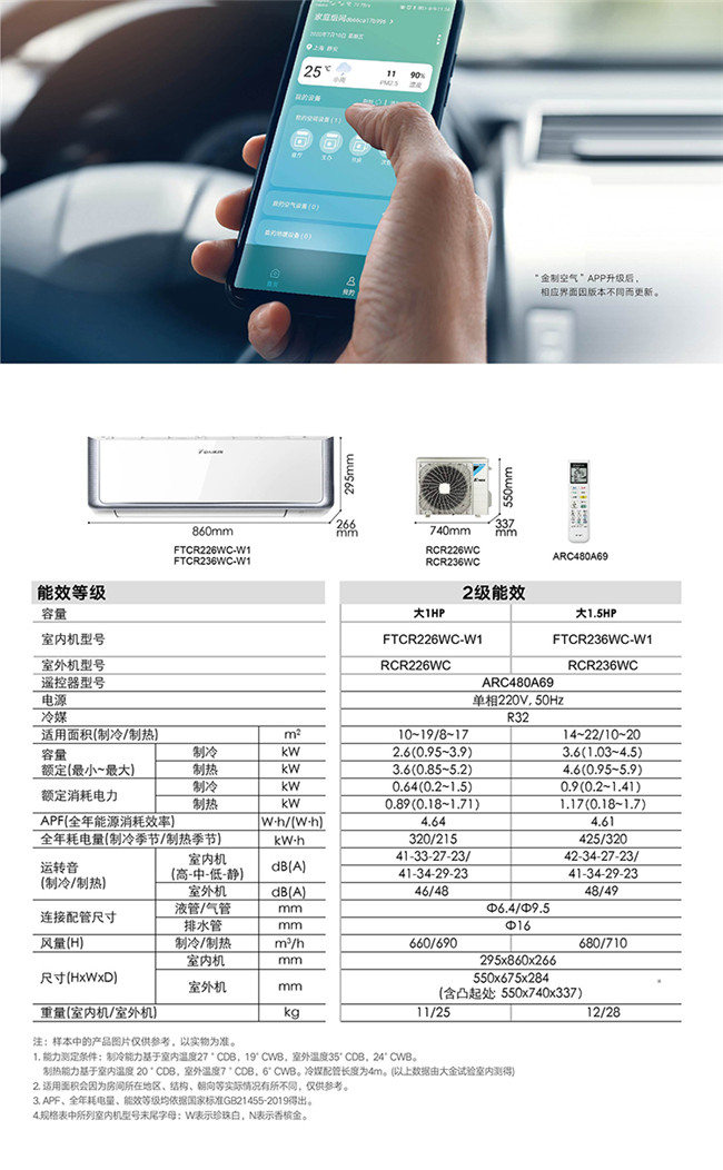 大金 1.5匹挂机 自清洁 新2级能效 冷暖变频空调 FTCR236WC-W1