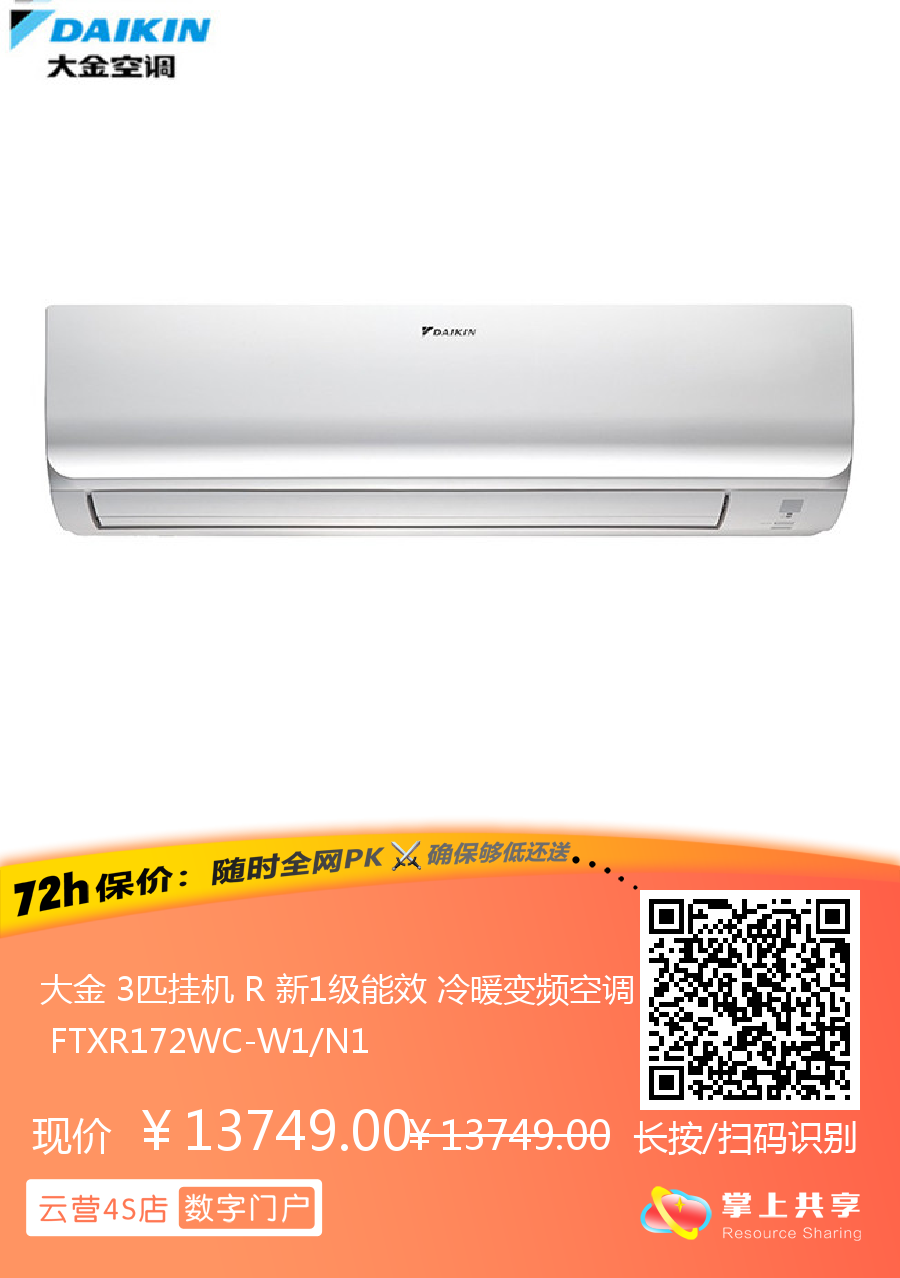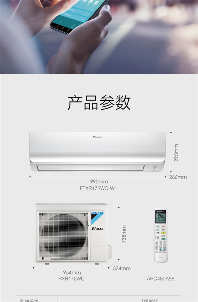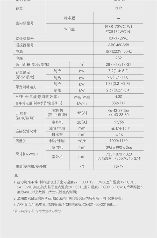 大金 3匹挂机 R 新1级能效 冷暖变频空调 FTXR172WC-W1/N1