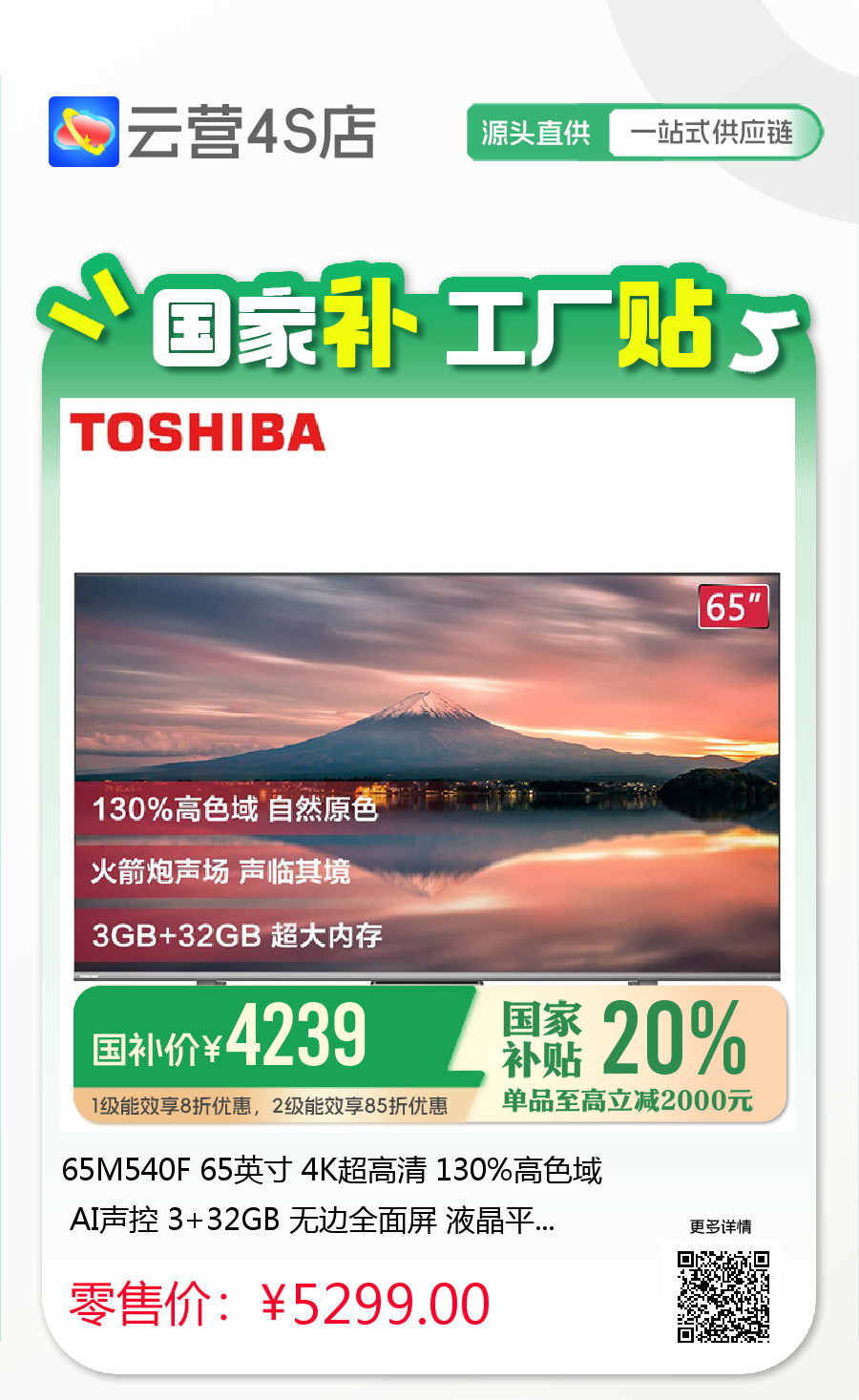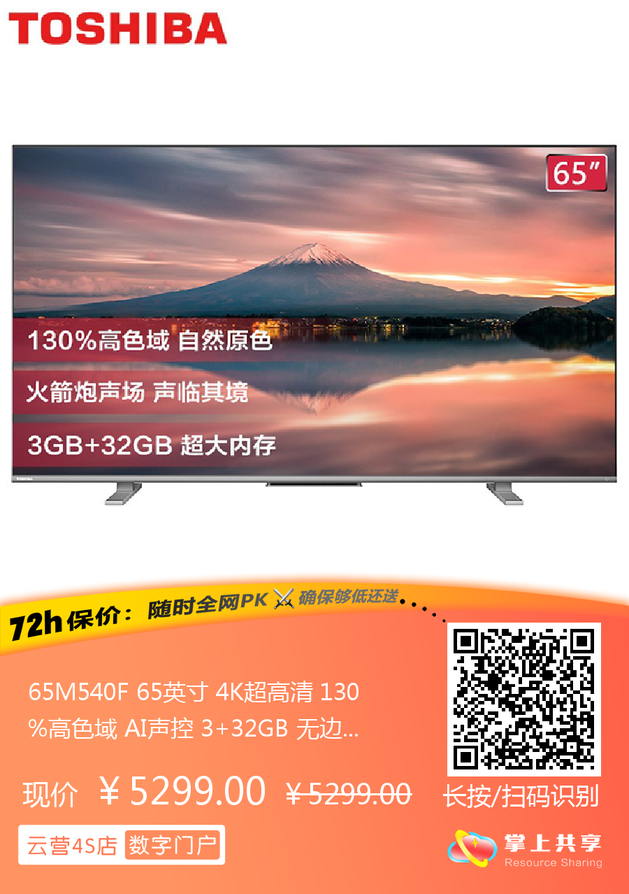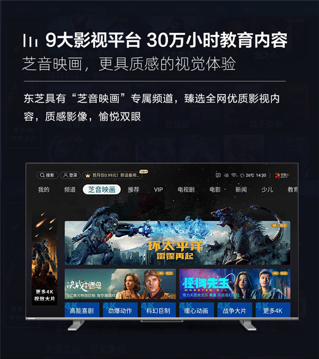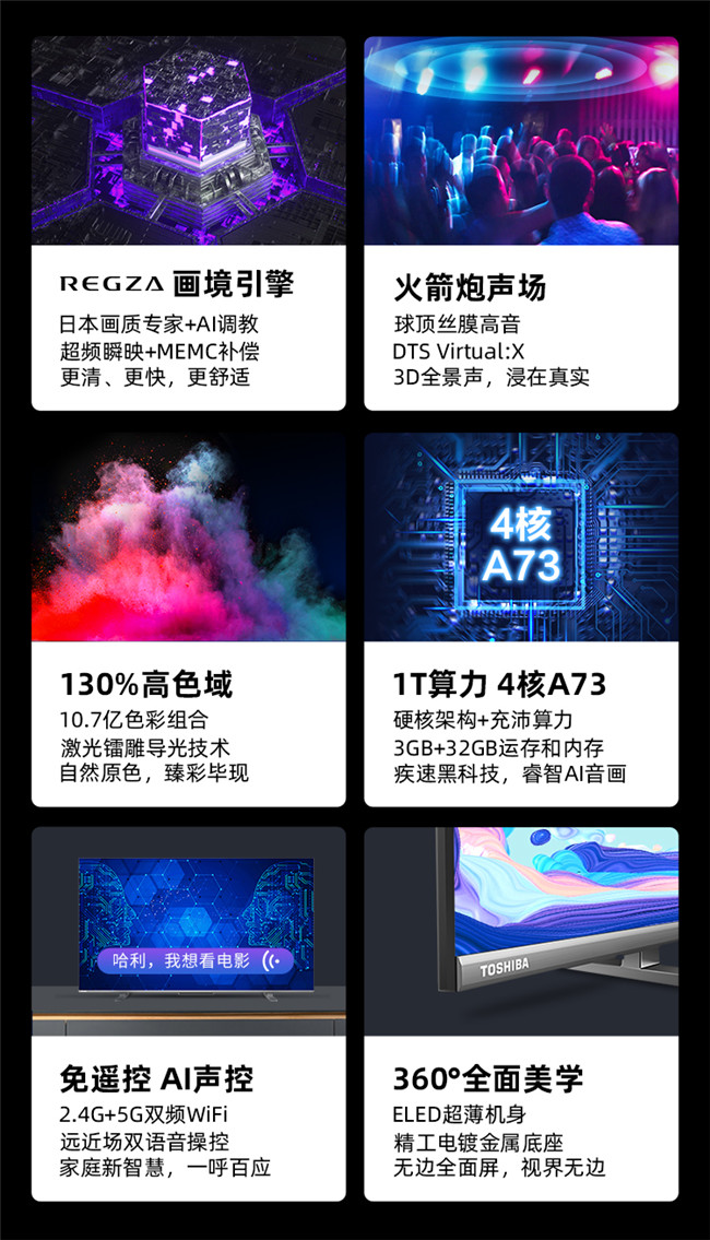 65M540F 65英寸 4K超高清 130%高色域 AI声控 3+32GB 无边全面屏 液晶平板电视机 东芝(TOSHIBA)