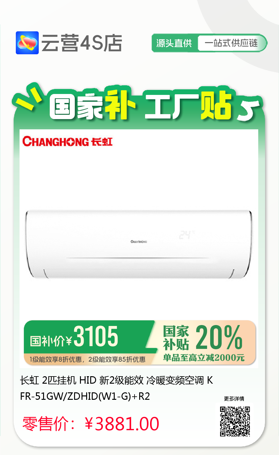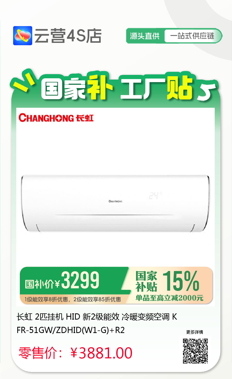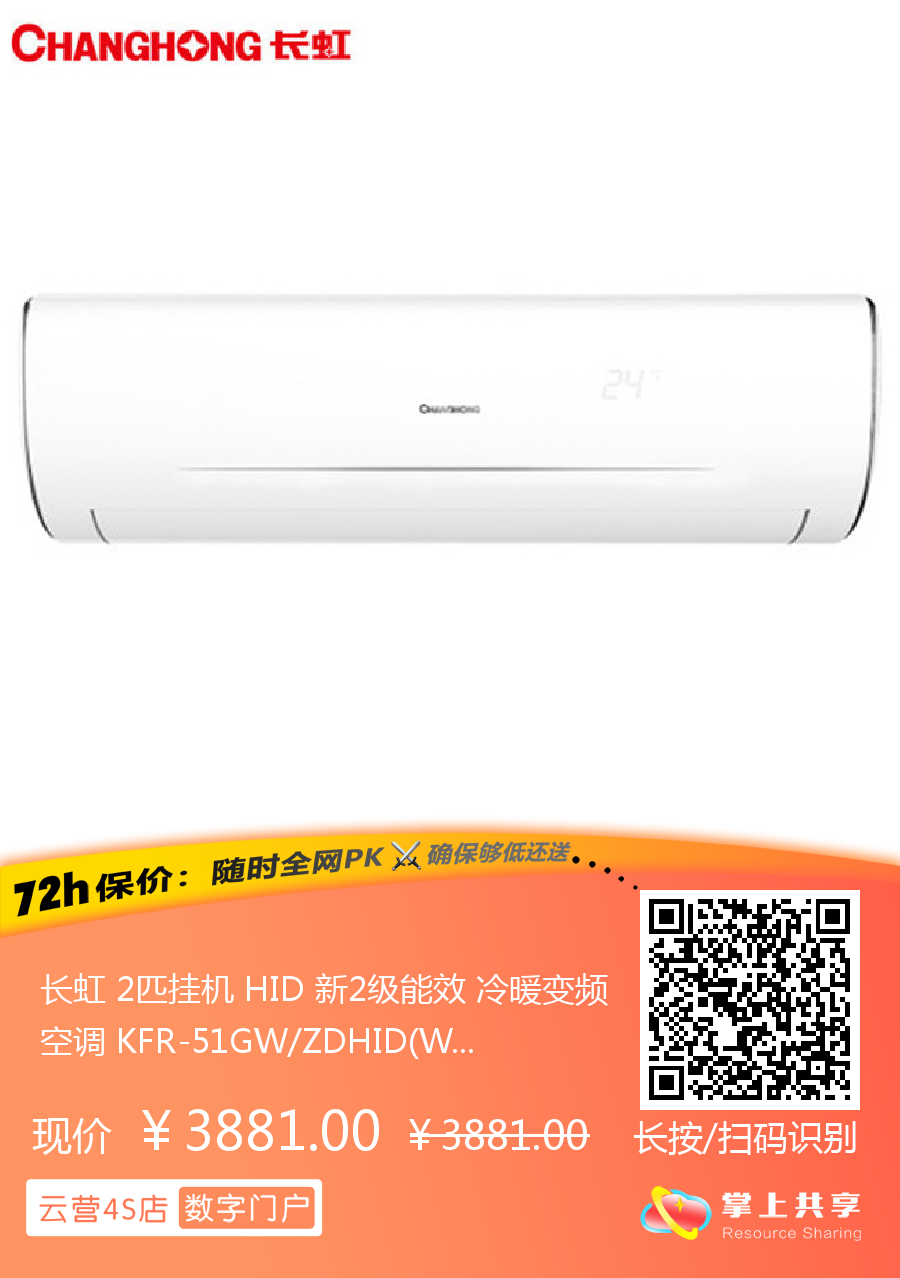 长虹 2匹挂机 HID 新2级能效 冷暖变频空调 KFR-51GW/ZDHID(W1-G)+R2
