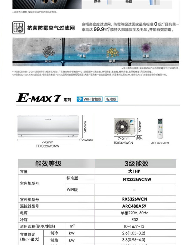 大金 大1匹挂机 S 新3级能效 冷暖变频空调 FTXS326WCNW/N