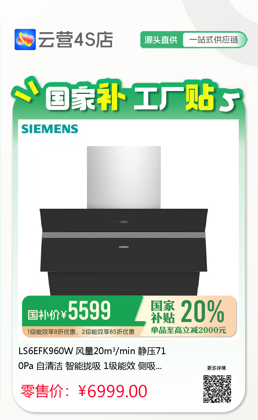 LS6EFK960W 风量20m³/min 静压710Pa 自清洁 智能拢吸 1级能效 侧吸