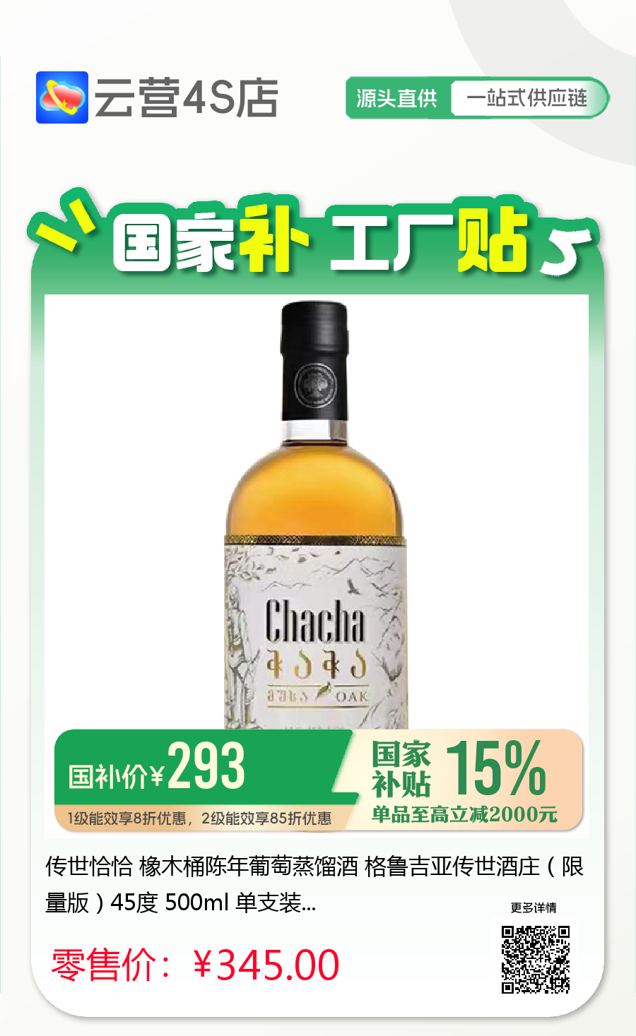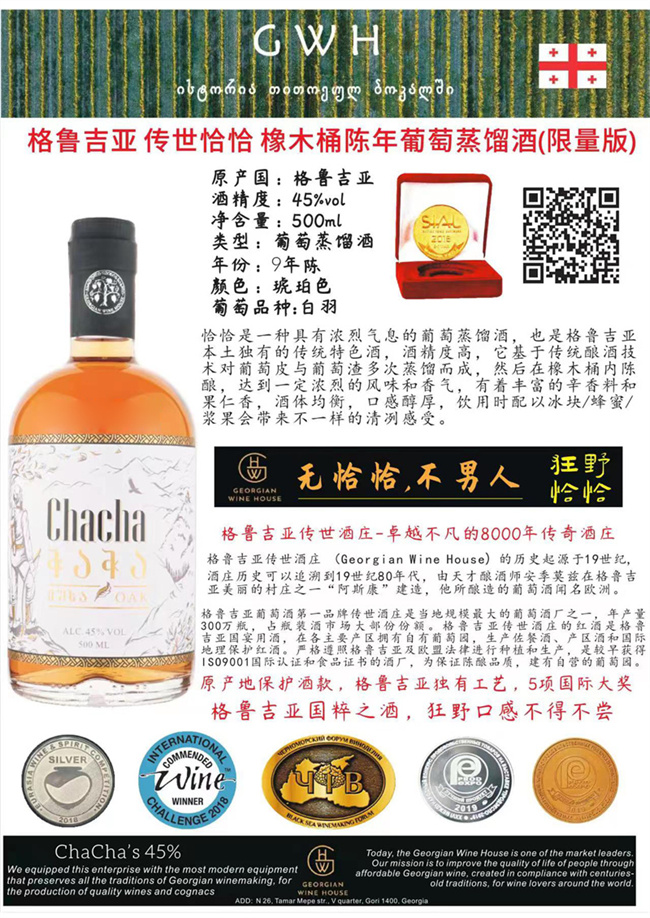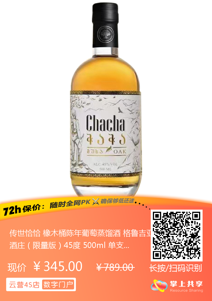 传世恰恰 橡木桶陈年葡萄蒸馏酒 格鲁吉亚传世酒庄(限量版)45度 500ml 单支装
