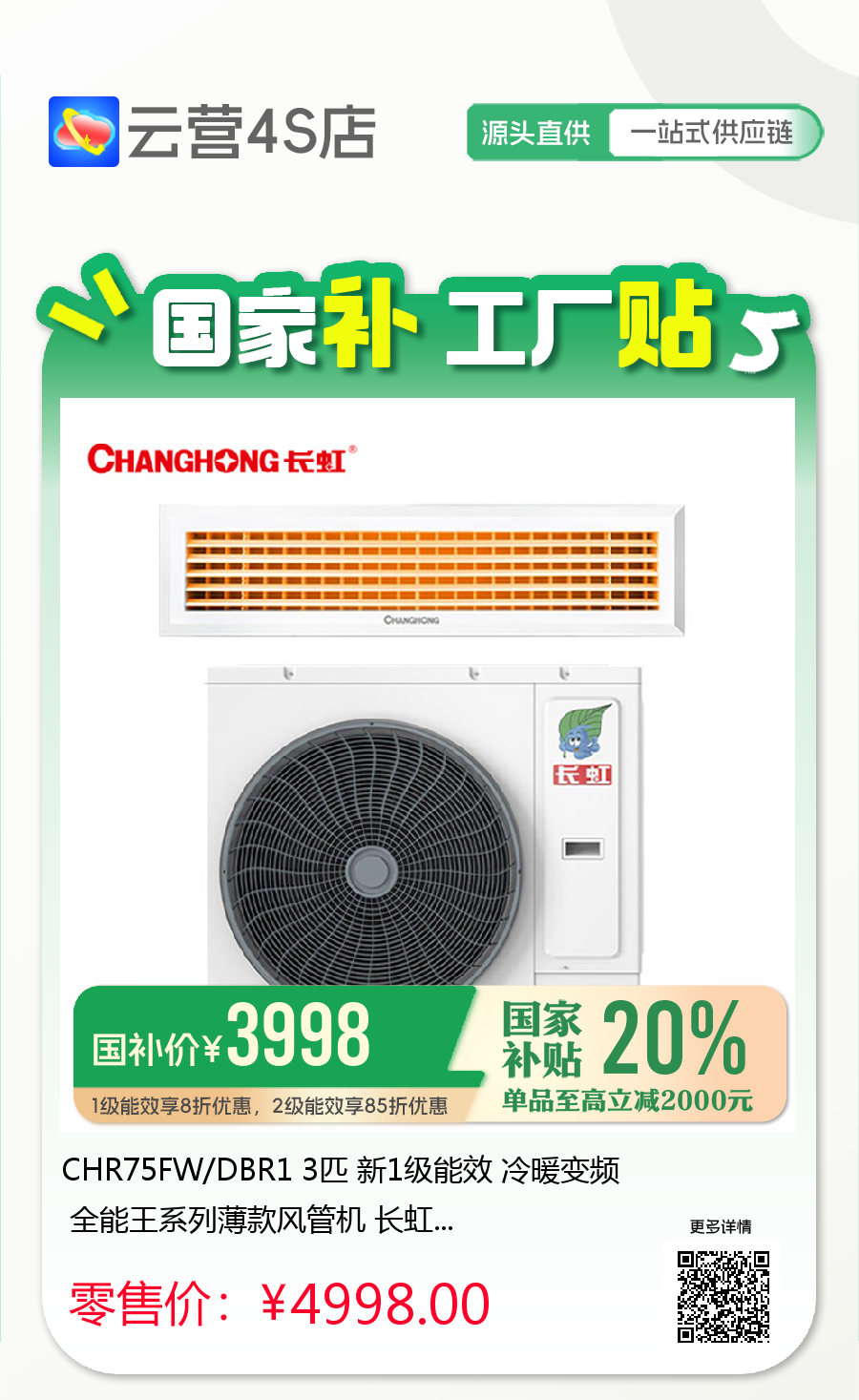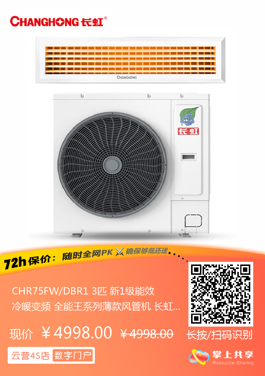 CHR75FW/DBR1 3匹 新1级能效 冷暖变频 全能王系列薄款风管机 长虹